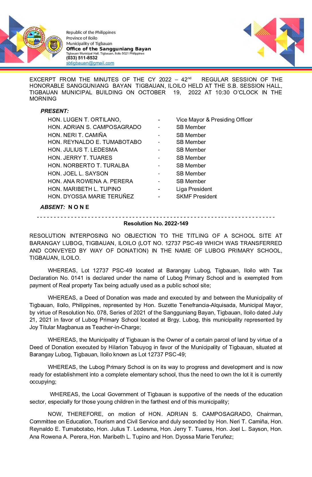 Resolution No. 2022-149 – RESOLUTION INTERPOSING NO OBJECTION TO THE TITLING OF A SCHOOL SITE AT BARANGAY LUBOG, TIGBAUAN, ILOILO (LOT NO. 12737 PSC-49 WHICH WAS TRANSFERRED AND CONVEYED BY WAY OF DONATION) IN THE NAME OF LUBOG PRIMARY SCHOOL, TIGBAUAN, ILOILO.