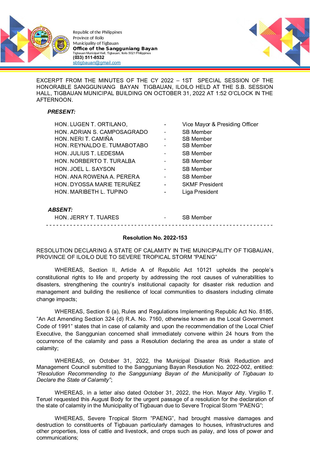 Resolution No. 2022-153 – RESOLUTION DECLARING A STATE OF CALAMITY IN THE MUNICIPALITY OF TIGBAUAN, PROVINCE OF ILOILO DUE TO SEVERE TROPICAL STORM “PAENG”