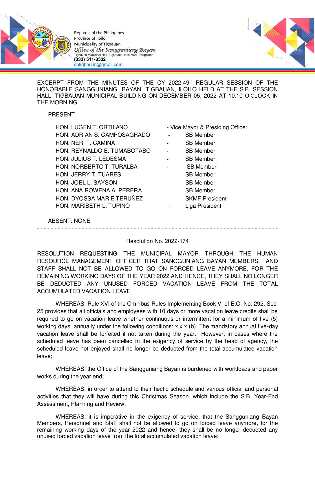 Resolution No. 2022-174 – RESOLUTION REQUESTING THE MUNICIPAL MAYOR THROUGH THE HUMAN RESOURCE MANAGEMENT OFFICER THAT SANGGUNIANG BAYAN MEMBERS, AND STAFF SHALL NOT BE ALLOWED TO GO ON FORCED LEAVE ANYMORE, FOR THE REMAINING WORKING DAYS OF THE YEAR 2022 AND HENCE, THEY SHALL NO LONGER BE DEDUCTED ANY UNUSED FORCED VACATION LEAVE FROM THE TOTAL ACCUMULATED VACATION LEAVE