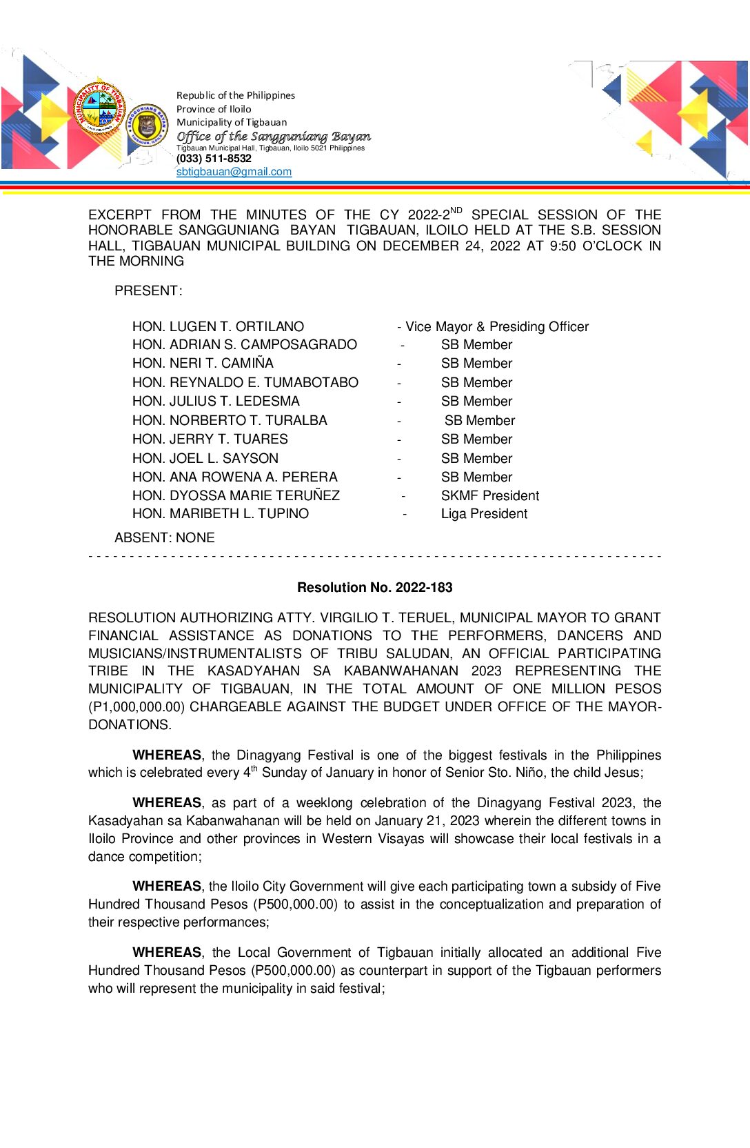 Resolution No. 2022-183 – RESOLUTION AUTHORIZING ATTY. VIRGILIO T. TERUEL, MUNICIPAL MAYOR TO GRANT FINANCIAL ASSISTANCE AS DONATIONS TO THE PERFORMERS, DANCERS AND MUSICIANS/INSTRUMENTALISTS OF TRIBU SALUDAN, AN OFFICIAL PARTICIPATING TRIBE IN THE KASADYAHAN SA KABANWAHANAN 2023 REPRESENTING THE MUNICIPALITY OF TIGBAUAN, IN THE TOTAL AMOUNT OF ONE MILLION PESOS (P1,000,000.00) CHARGEABLE AGAINST THE BUDGET UNDER OFFICE OF THE MAYOR- DONATIONS.
