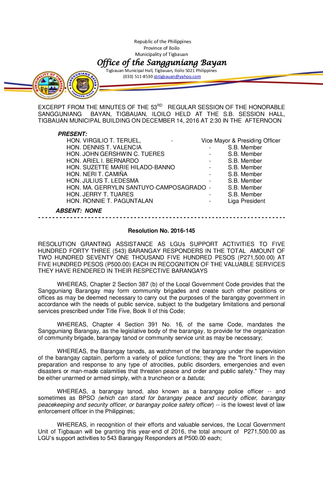 Resolution No. 2016-145 – RESOLUTION GRANTING ASSISTANCE AS LGUs SUPPORT ACTIVITIES TO FIVE HUNDRED FORTY THREE (543) BARANGAY RESPONDERS IN THE TOTAL AMOUNT OF TWO HUNDRED SEVENTY ONE THOUSAND FIVE HUNDRED PESOS (P271,500.00) AT FIVE HUNDRED PESOS (P500.00) EACH IN RECOGNITION OF THE VALUABLE SERVICES THEY HAVE RENDERED IN THEIR RESPECTIVE BARANGAYS