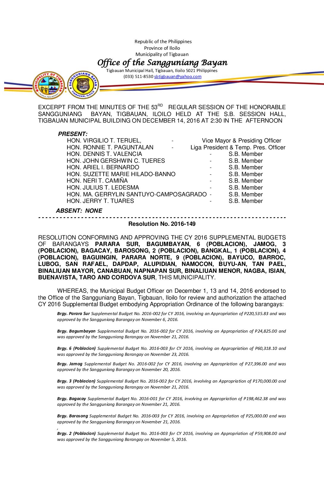 Resolution No. 2016-149 – RESOLUTION CONFORMING AND APPROVING THE CY 2016 SUPPLEMENTAL BUDGETS OF BARANGAYS PARARA SUR, BAGUMBAYAN, 6 (POBLACION), JAMOG, 3 (POBLACION), BAGACAY, BAROSONG, 2 (POBLACION), BANGKAL, 1 (POBLACION), 4 (POBLACION), BAGUINGIN, PARARA NORTE, 9 (POBLACION), BAYUCO, BARROC, LUBOG, SAN RAFAEL, DAPDAP, ALUPIDIAN, NAMOCON, BUYU-AN, TAN PAEL, BINALIUAN MAYOR, CANABUAN, NAPNAPAN SUR, BINALIUAN MENOR, NAGBA, ISIAN, BUENAVISTA, TARO AND CORDOVA SUR, THIS MUNICIPALITY.