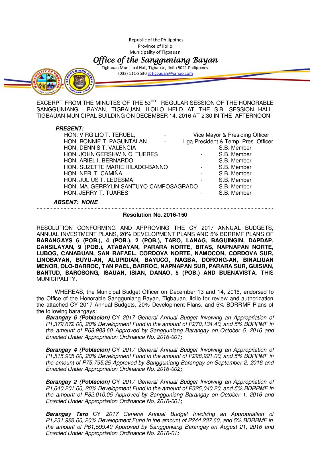 Resolution No. 2016-150 – RESOLUTION CONFORMING AND APPROVING THE CY 2017 ANNUAL BUDGETS, ANNUAL INVESTMENT PLANS, 20% DEVELOPMENT PLANS AND 5% BDRRMF PLANS OF BARANGAYS 6 (POB.), 4 (POB.), 2 (POB.), TARO, LANAG, BAGUINGIN, DAPDAP, CANSILAYAN, 9 (POB.), ATABAYAN, PARARA NORTE, BITAS, NAPNAPAN NORTE, LUBOG, CANABUAN, SAN RAFAEL, CORDOVA NORTE, NAMOCON, CORDOVA SUR, LINOBAYAN, BUYU-AN, ALUPIDIAN, BAYUCO, NAGBA, DORONG-AN, BINALIUAN MENOR, OLO-BARROC, TAN PAEL, BARROC, NAPNAPAN SUR, PARARA SUR, GUISIAN, BANTUD, BAROSONG, ISAUAN, ISIAN, DANAO, 5 (POB.) AND BUENAVISTA, THIS MUNICIPALITY.