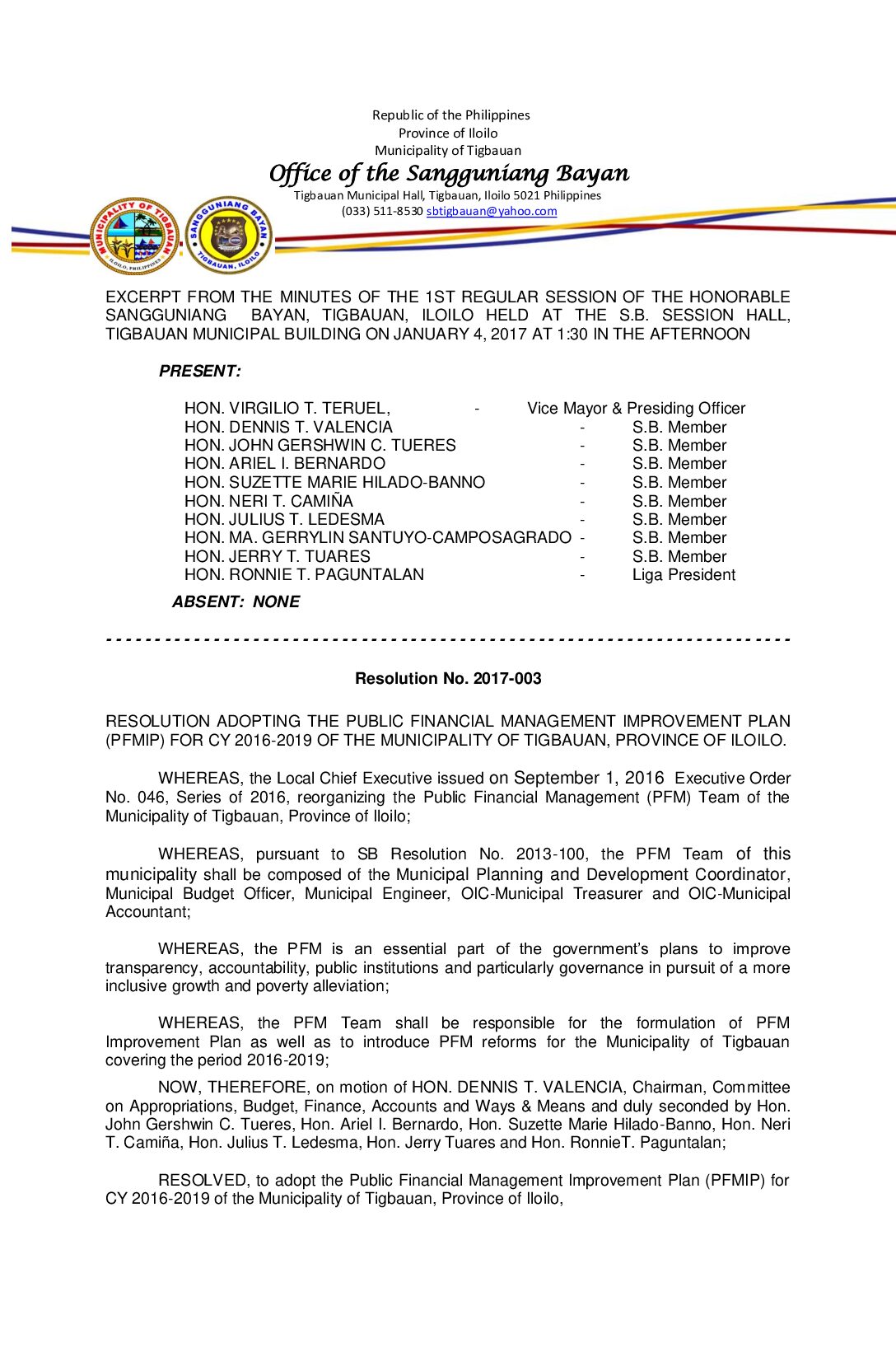 Resolution No. 2017-003 – RESOLUTION ADOPTING THE PUBLIC FINANCIAL MANAGEMENT IMPROVEMENT PLAN (PFMIP) FOR CY 2016-2019 OF THE MUNICIPALITY OF TIGBAUAN, PROVINCE OF ILOILO.