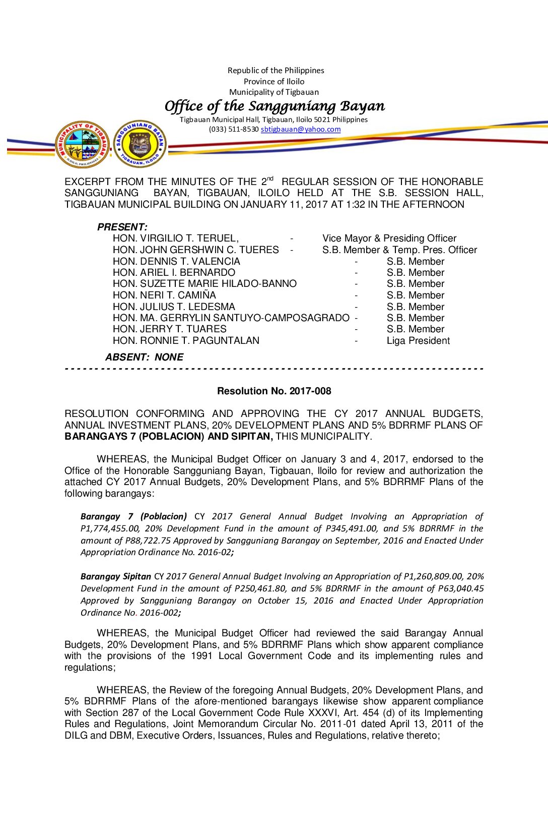 Resolution No. 2017-008 – RESOLUTION CONFORMING AND APPROVING THE CY 2017 ANNUAL BUDGETS, ANNUAL INVESTMENT PLANS, 20% DEVELOPMENT PLANS AND 5% BDRRMF PLANS OF BARANGAYS 7 (POBLACION) AND SIPITAN, THIS MUNICIPALITY.