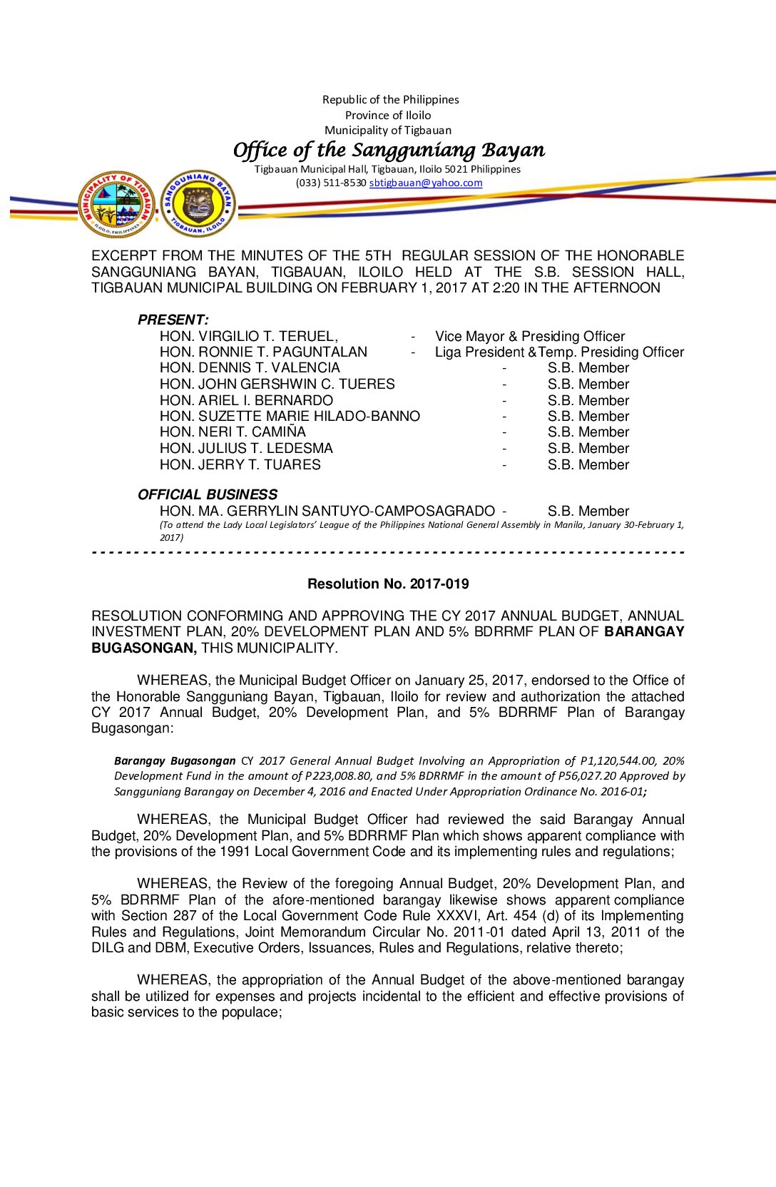 Resolution No. 2017-019 – RESOLUTION CONFORMING AND APPROVING THE CY 2017 ANNUAL BUDGET, ANNUAL INVESTMENT PLAN, 20% DEVELOPMENT PLAN AND 5% BDRRMF PLAN OF BARANGAY BUGASONGAN, THIS MUNICIPALITY.