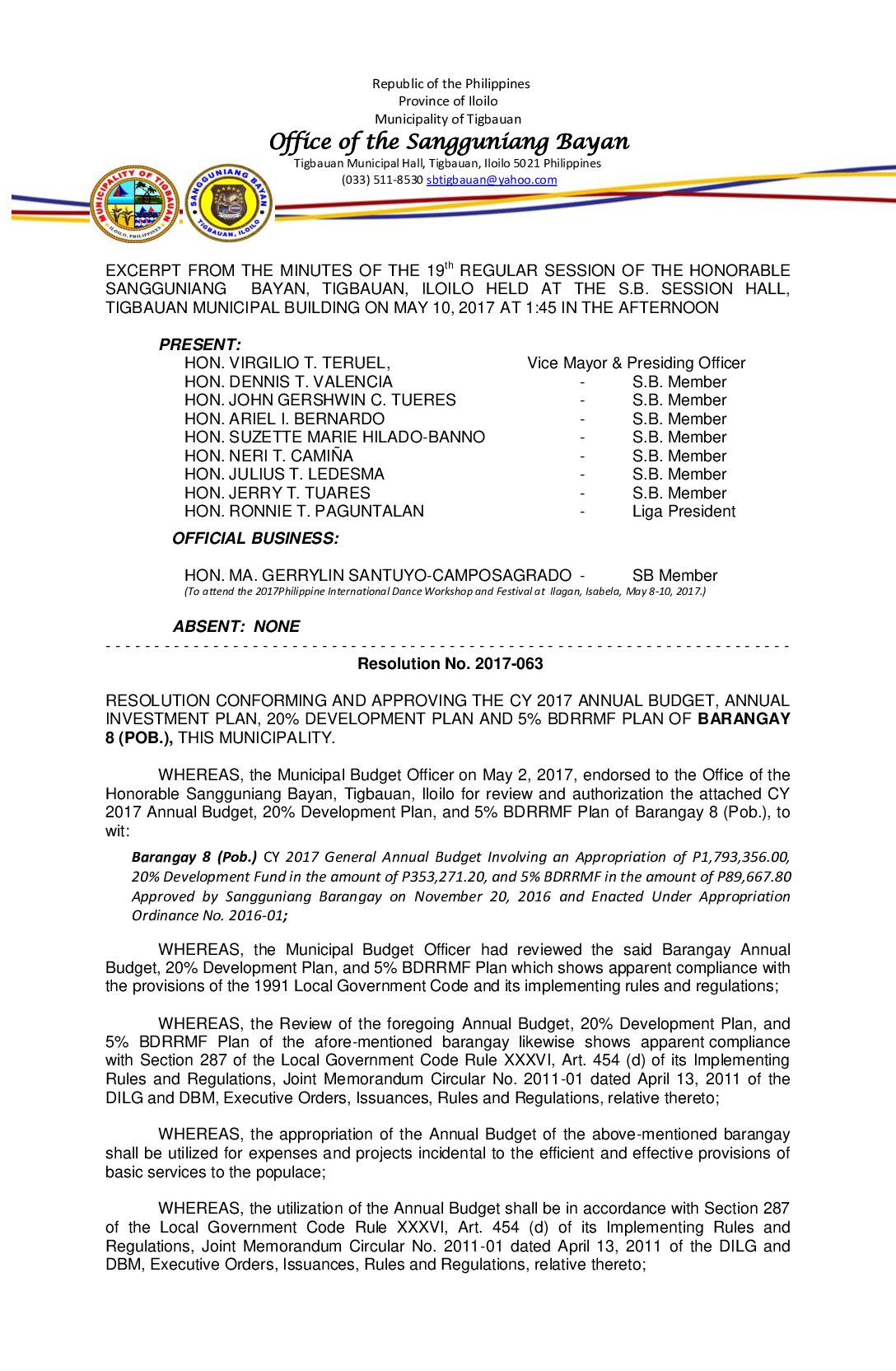 Resolution No. 2017-063 – RESOLUTION CONFORMING AND APPROVING THE CY 2017 ANNUAL BUDGET, ANNUAL INVESTMENT PLAN, 20% DEVELOPMENT PLAN AND 5% BDRRMF PLAN OF BARANGAY 8 (POB.), THIS MUNICIPALITY.