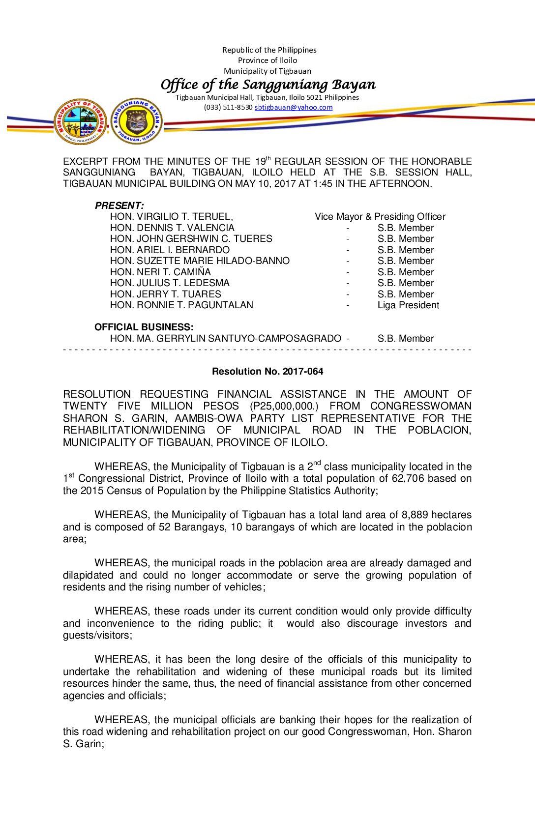 Resolution No. 2017-064 – RESOLUTION REQUESTING FINANCIAL ASSISTANCE IN THE AMOUNT OF TWENTY FIVE MILLION PESOS (P25,000,000.) FROM CONGRESSWOMAN SHARON S. GARIN, AAMBIS-OWA PARTY LIST REPRESENTATIVE FOR THE REHABILITATION/WIDENING OF MUNICIPAL ROAD IN THE POBLACION, MUNICIPALITY OF TIGBAUAN, PROVINCE OF ILOILO.