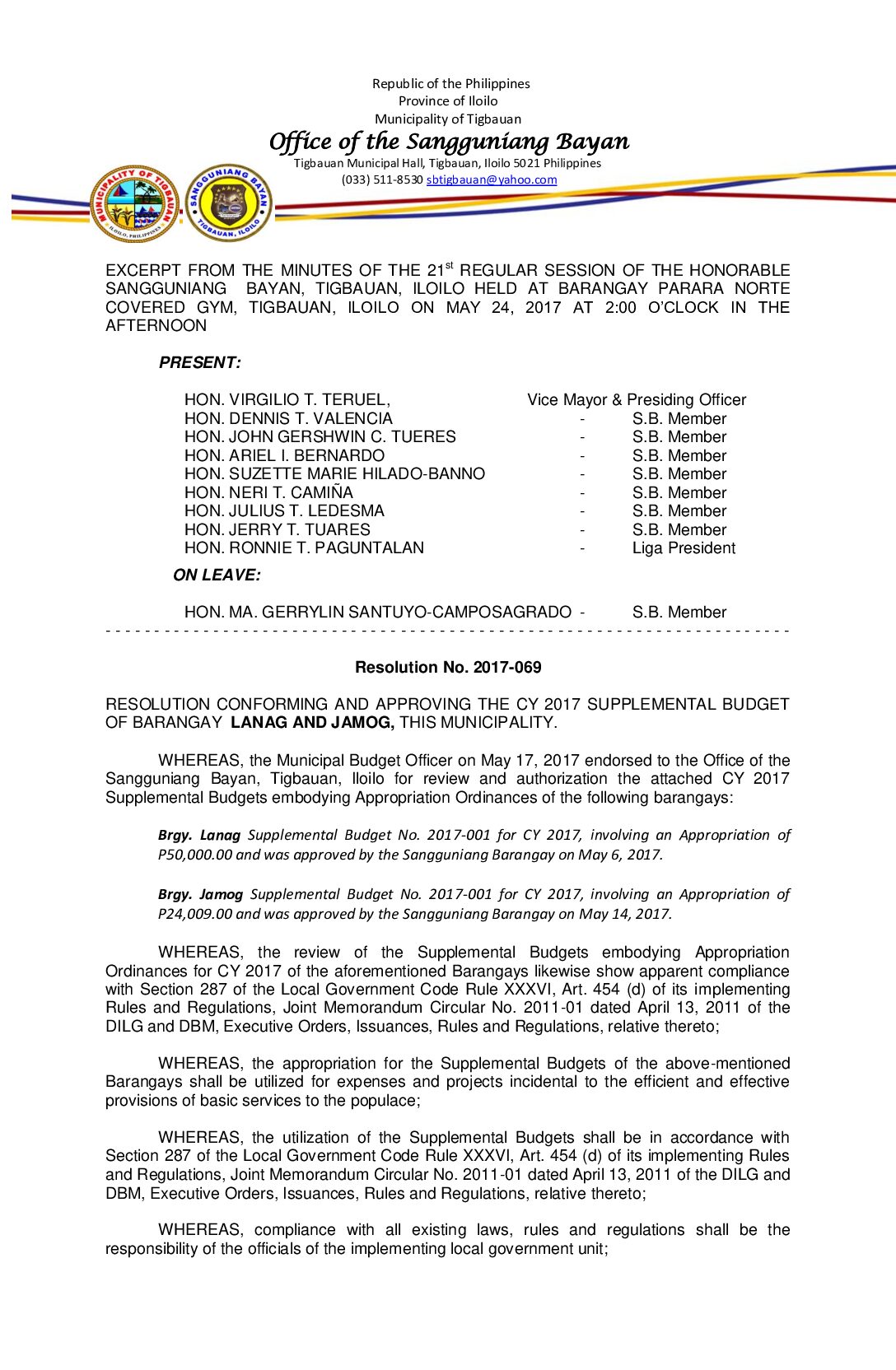 Resolution No. 2017-069 – RESOLUTION CONFORMING AND APPROVING THE CY 2017 SUPPLEMENTAL BUDGET OF BARANGAY LANAG AND JAMOG, THIS MUNICIPALITY.