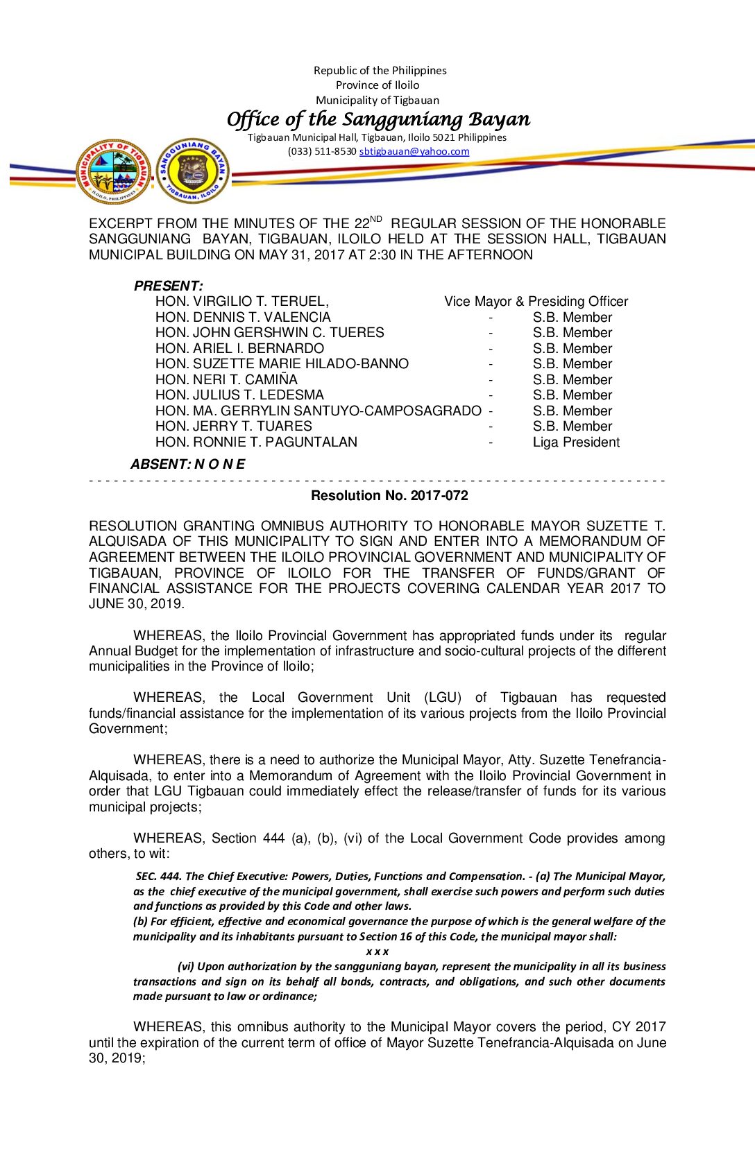 Resolution No. 2017-072 – RESOLUTION GRANTING OMNIBUS AUTHORITY TO HONORABLE MAYOR SUZETTE T. ALQUISADA OF THIS MUNICIPALITY TO SIGN AND ENTER INTO A MEMORANDUM OF AGREEMENT BETWEEN THE ILOILO PROVINCIAL GOVERNMENT AND MUNICIPALITY OF TIGBAUAN, PROVINCE OF ILOILO FOR THE TRANSFER OF FUNDS/GRANT OF FINANCIAL ASSISTANCE FOR THE PROJECTS COVERING CALENDAR YEAR 2017 TO JUNE 30, 2019.