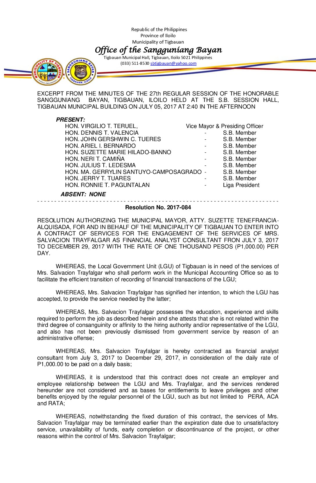 July 12, 2017 Comment off Resolution No. 2017-088 – RESOLUTION AUTHORIZING THE MUNICIPAL MAYOR, ATTY. SUZETTE TENEFRANCIA- ALQUISADA FOR AND IN BEHALF OF THE MUNICIPALITY OF TIGBAUAN, TO ENTER INTO A MEMORANDUM OF AGREEMENT (MOA) WITH WEST VISAYAS STATE UNIVERSITY (WVSU) AND THE DEPARTMENT OF EDUCATION (DEPED) FOR THE IMPLEMENTATION OF COMMUNITY BASED INTERVENTION PROJECT(CBIP) FOR THE PERSONS WITH DISABILITY (PWD) AND CHILDREN WITH SPECIAL NEEDS INCLUDING THOSE AT RISK IN THE MUNICIPALITY OF TIGBAUAN, PROVINCE OF ILOILO. Read more