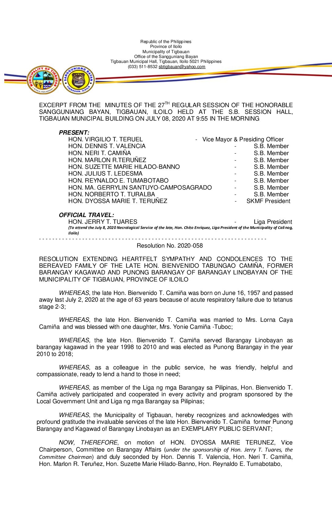 Resolution No. 2020-058 – RESOLUTION EXTENDING HEARTFELT SYMPATHY AND CONDOLENCES TO THE BEREAVED FAMILY OF THE LATE HON. BIENVENIDO TABUNGAO CAMIÑA, FORMER BARANGAY KAGAWAD AND PUNONG BARANGAY OF BARANGAY LINOBAYAN OF THE MUNICIPALITY OF TIGBAUAN, PROVINCE OF ILOILO