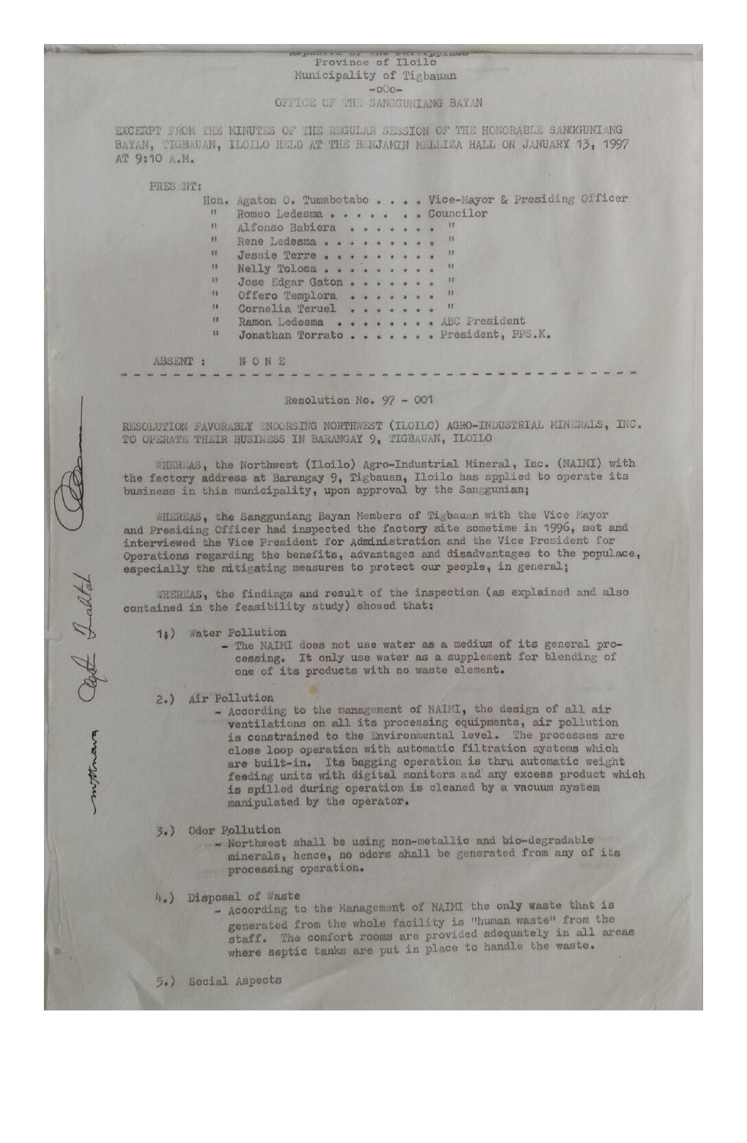Resolution No. 97-001