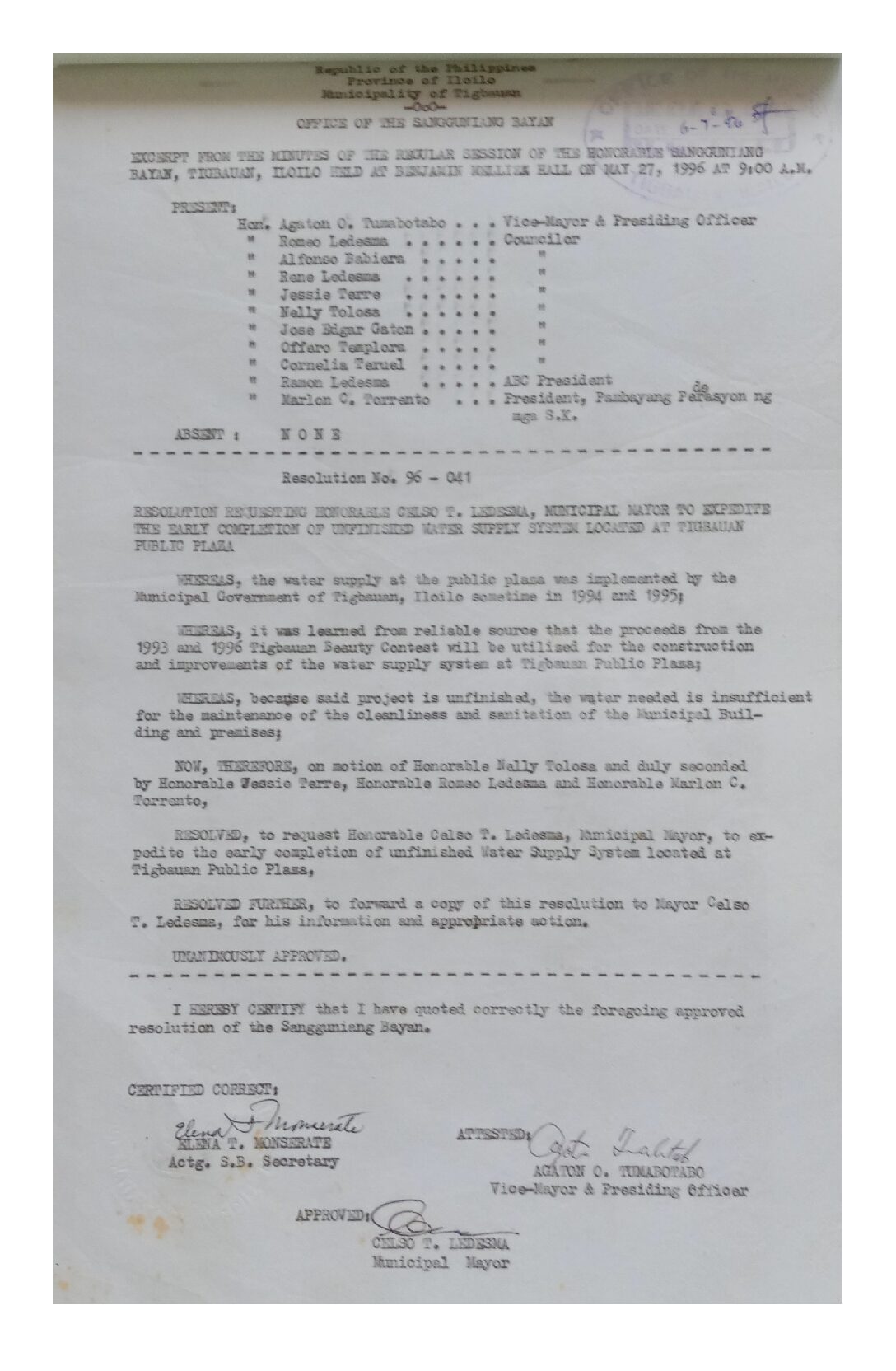 Resolution No. 96-041