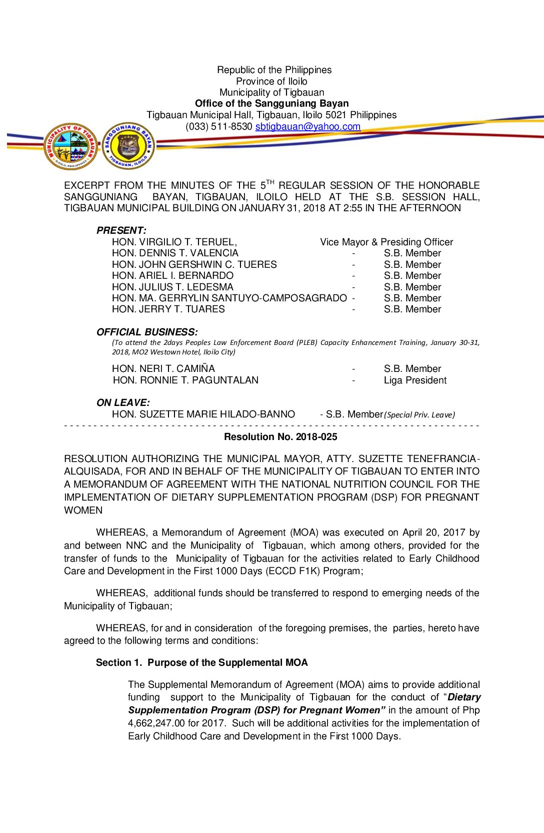 Resolution No. 2018-025 – RESOLUTION AUTHORIZING THE MUNICIPAL MAYOR, ATTY. SUZETTE TENEFRANCIA- ALQUISADA, FOR AND IN BEHALF OF THE MUNICIPALITY OF TIGBAUAN TO ENTER INTO A MEMORANDUM OF AGREEMENT WITH THE NATIONAL NUTRITION COUNCIL FOR THE IMPLEMENTATION OF DIETARY SUPPLEMENTATION PROGRAM (DSP) FOR PREGNANT WOMEN