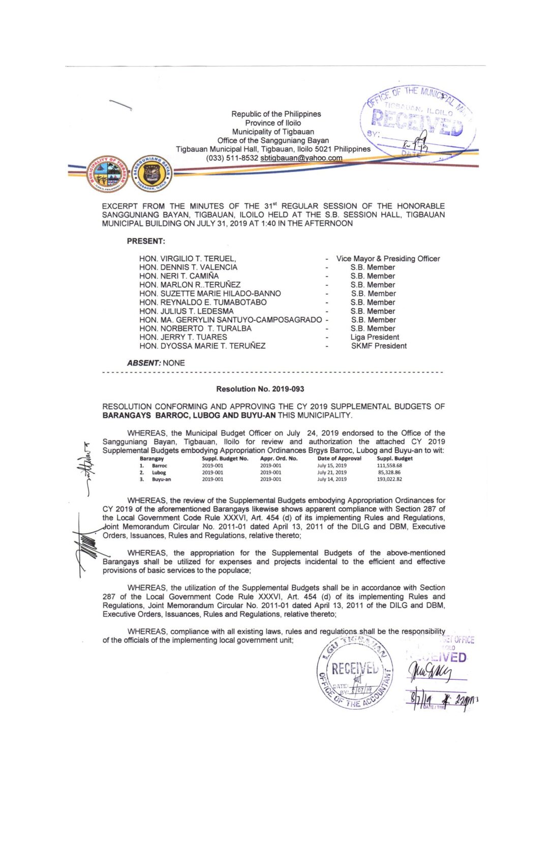 Resolution No. 2019-093 – RESOLUTION AUTHORIZING THE MUNICIPAL MAYOR, ATTY. SUZETTE T. ALQUISADA, FOR AND IN BEHALF OF THE MUNICIPALITY OF TIGBAUAN TO ENTER INTO A MEMORANDUM OF AGREEMENT (MOA) WITH THE DEPARTMENT OF HEALTH-WESTERN VISAYAS CENTER FOR HEALTH AND DEVELOPMENT FOR THE TRANSFER OF FUNDS FOR COVID-19 SPECIAL RISK ALLOWANCE (SRA) FROM THE DEPARTMENT OF HEALTH (DOH) TO THE MUNICIPALITY OF TIGBAUAN.