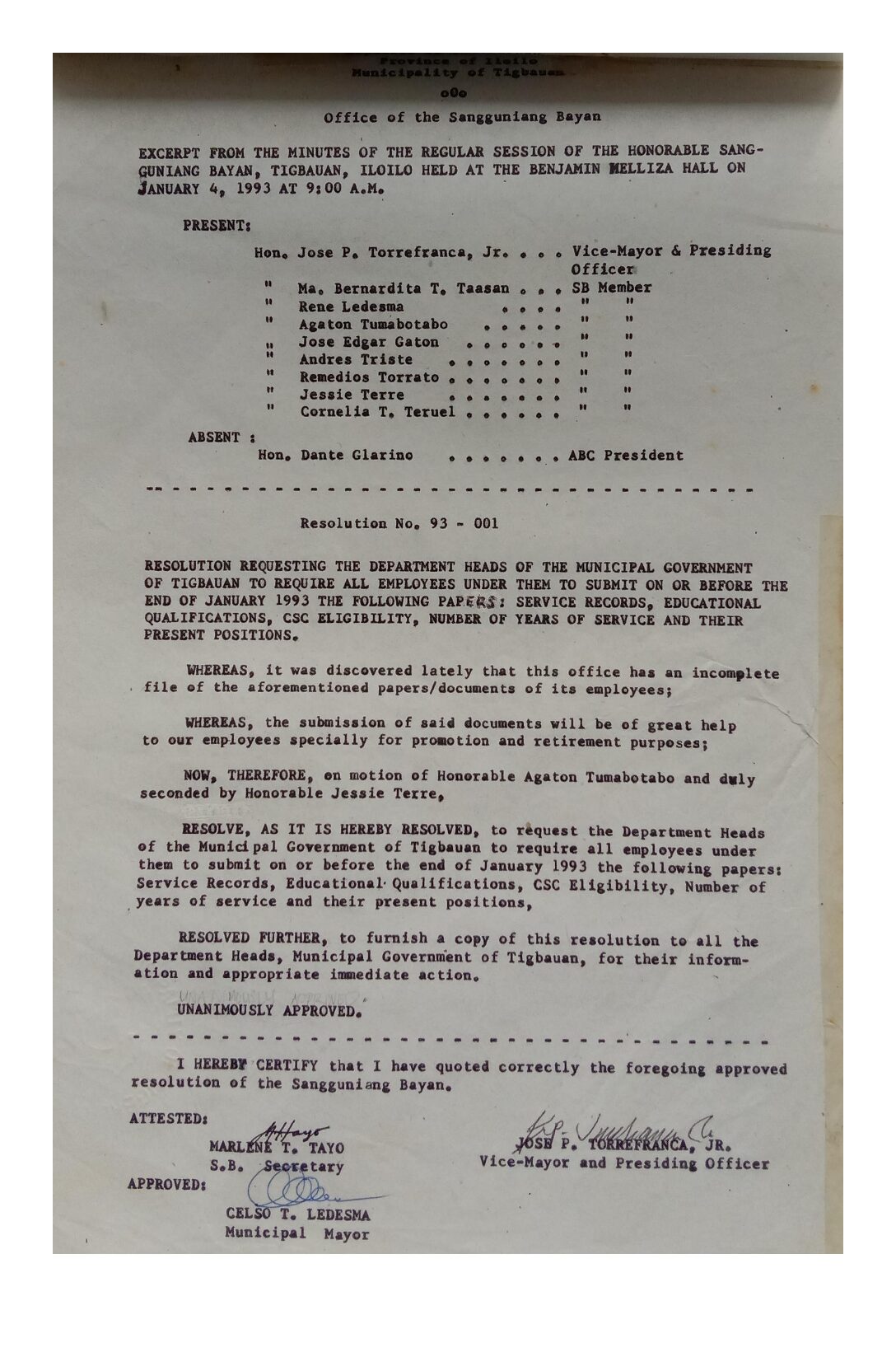 Resolution No. 93-001