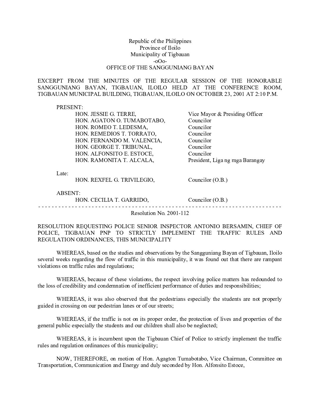 Resolution No. 2001-112