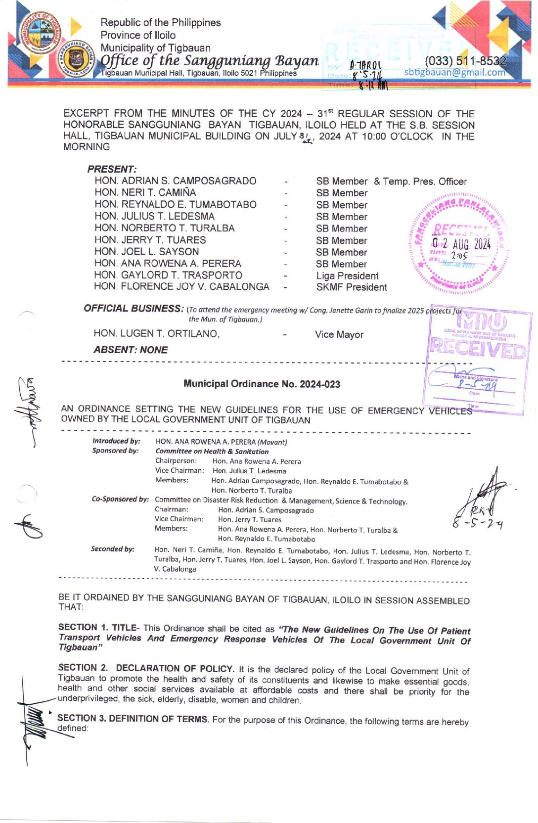 Municipal Ordinance No. 2024-023 – AN ORDINANCE SETTING THE NEW GUIDELINES FOR THE USE OF EMERGENCY VEHICLES OWNED BY THE LOCAL GOVERNMENT UNIT TIGBAUAN