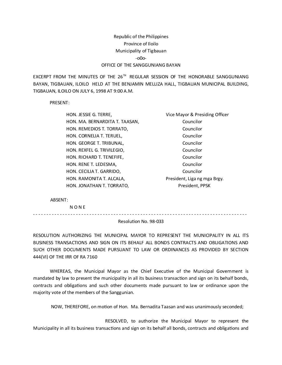 Resolution No. 98-033