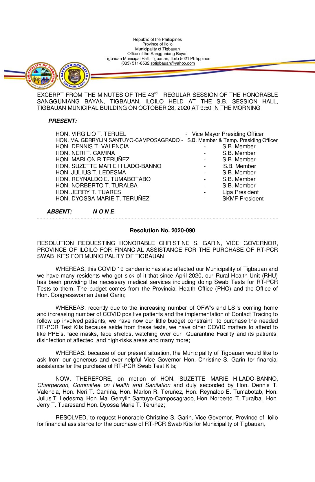 Resolution No. 2020-090 – RESOLUTION REQUESTING HONORABLE CHRISTINE S. GARIN, VICE GOVERNOR, PROVINCE OF ILOILO FOR FINANCIAL ASSISTANCE FOR THE PURCHASE OF RT-PCR SWAB KITS FOR MUNICIPALITY OF TIGBAUAN