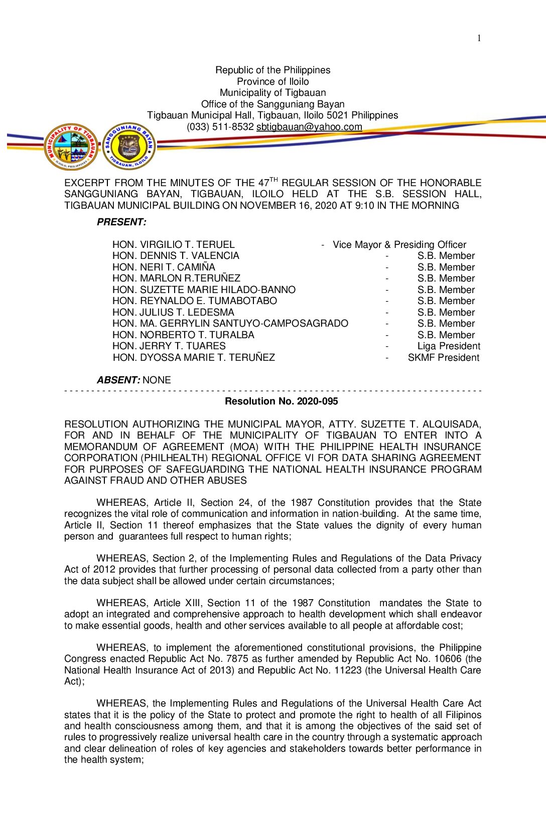 Resolution No. 2020-095 – RESOLUTION AUTHORIZING THE MUNICIPAL MAYOR, ATTY. SUZETTE T. ALQUISADA, FOR AND IN BEHALF OF THE MUNICIPALITY OF TIGBAUAN TO ENTER INTO A MEMORANDUM OF AGREEMENT (MOA) WITH THE PHILIPPINE HEALTH INSURANCE CORPORATION (PHILHEALTH) REGIONAL OFFICE VI FOR DATA SHARING AGREEMENT FOR PURPOSES OF SAFEGUARDING THE NATIONAL HEALTH INSURANCE PROGRAM AGAINST FRAUD AND OTHER ABUSES