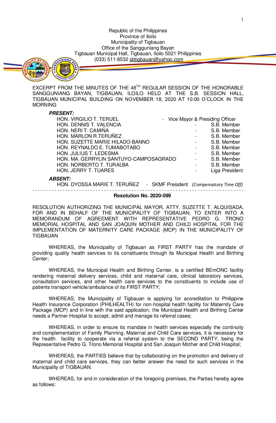 Resolution No. 2020-099 – RESOLUTION AUTHORIZING THE MUNICIPAL MAYOR, ATTY. SUZETTE T. ALQUISADA, FOR AND IN BEHALF OF THE MUNICIPALITY OF TIGBAUAN, TO ENTER INTO A MEMORANDUM OF AGREEMENT WITH REPRESENTATIVE PEDRO G. TRONO MEMORIAL HOSPITAL AND SAN JOAQUIN MOTHER AND CHILD HOSPITAL FOR THE IMPLEMENTATION OF MATERNITY CARE PACKAGE (MCP) IN THE MUNICIPALITY OF TIGBAUAN