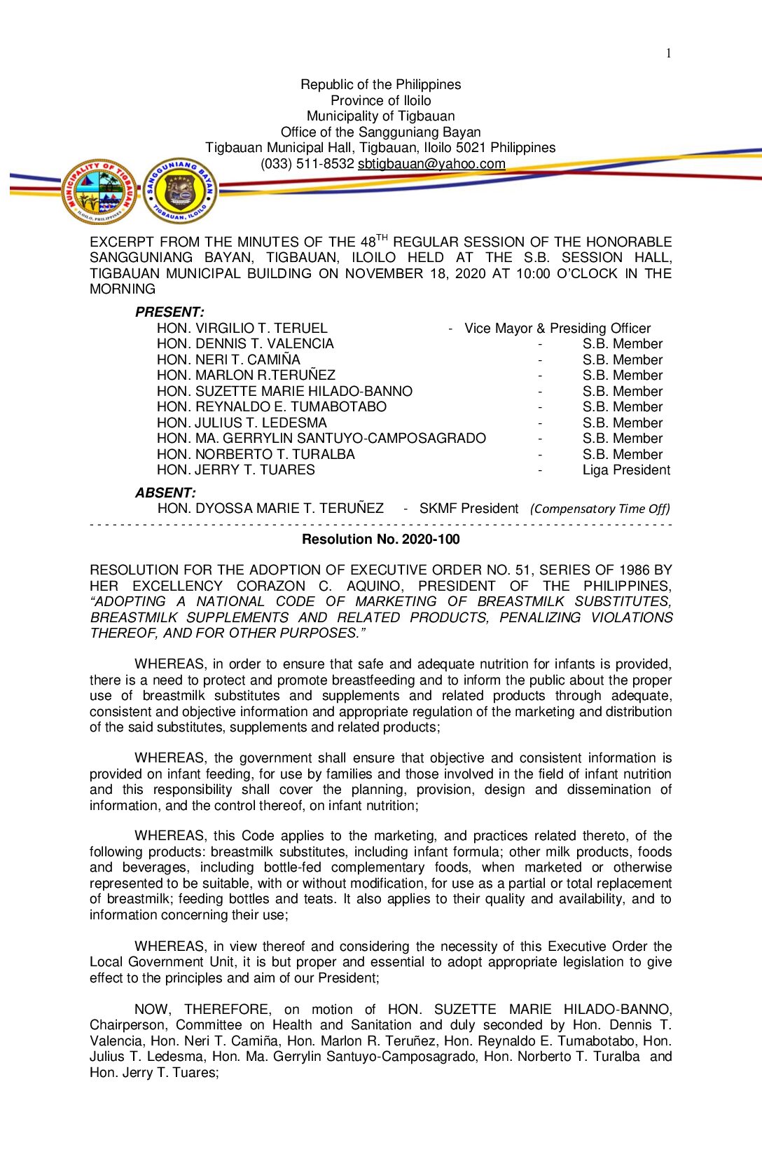 Resolution No. 2020-100 – RESOLUTION FOR THE ADOPTION OF EXECUTIVE ORDER NO. 51, SERIES OF 1986 BY HER EXCELLENCY CORAZON C. AQUINO, PRESIDENT OF THE PHILIPPINES, “ADOPTING A NATIONAL CODE OF MARKETING OF BREASTMILK SUBSTITUTES, BREASTMILK SUPPLEMENTS AND RELATED PRODUCTS, PENALIZING VIOLATIONS THEREOF, AND FOR OTHER PURPOSES.”