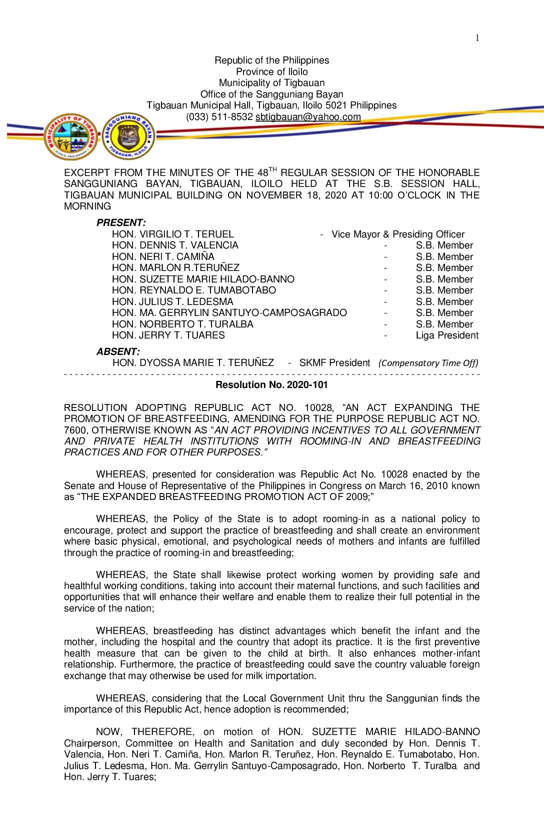 Resolution No. 2020-101 – RESOLUTION ADOPTING REPUBLIC ACT NO. 10028, “AN ACT EXPANDING THE PROMOTION OF BREASTFEEDING, AMENDING FOR THE PURPOSE REPUBLIC ACT NO. 7600, OTHERWISE KNOWN AS “AN ACT PROVIDING INCENTIVES TO ALL GOVERNMENT AND PRIVATE HEALTH INSTITUTIONS WITH ROOMING-IN AND BREASTFEEDING PRACTICES AND FOR OTHER PURPOSES.”