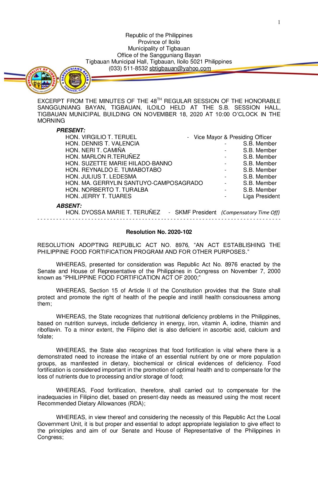 Resolution No. 2020-102 – RESOLUTION ADOPTING REPUBLIC ACT NO. 8976, “AN ACT ESTABLISHING THE PHILIPPINE FOOD FORTIFICATION PROGRAM AND FOR OTHER PURPOSES.”