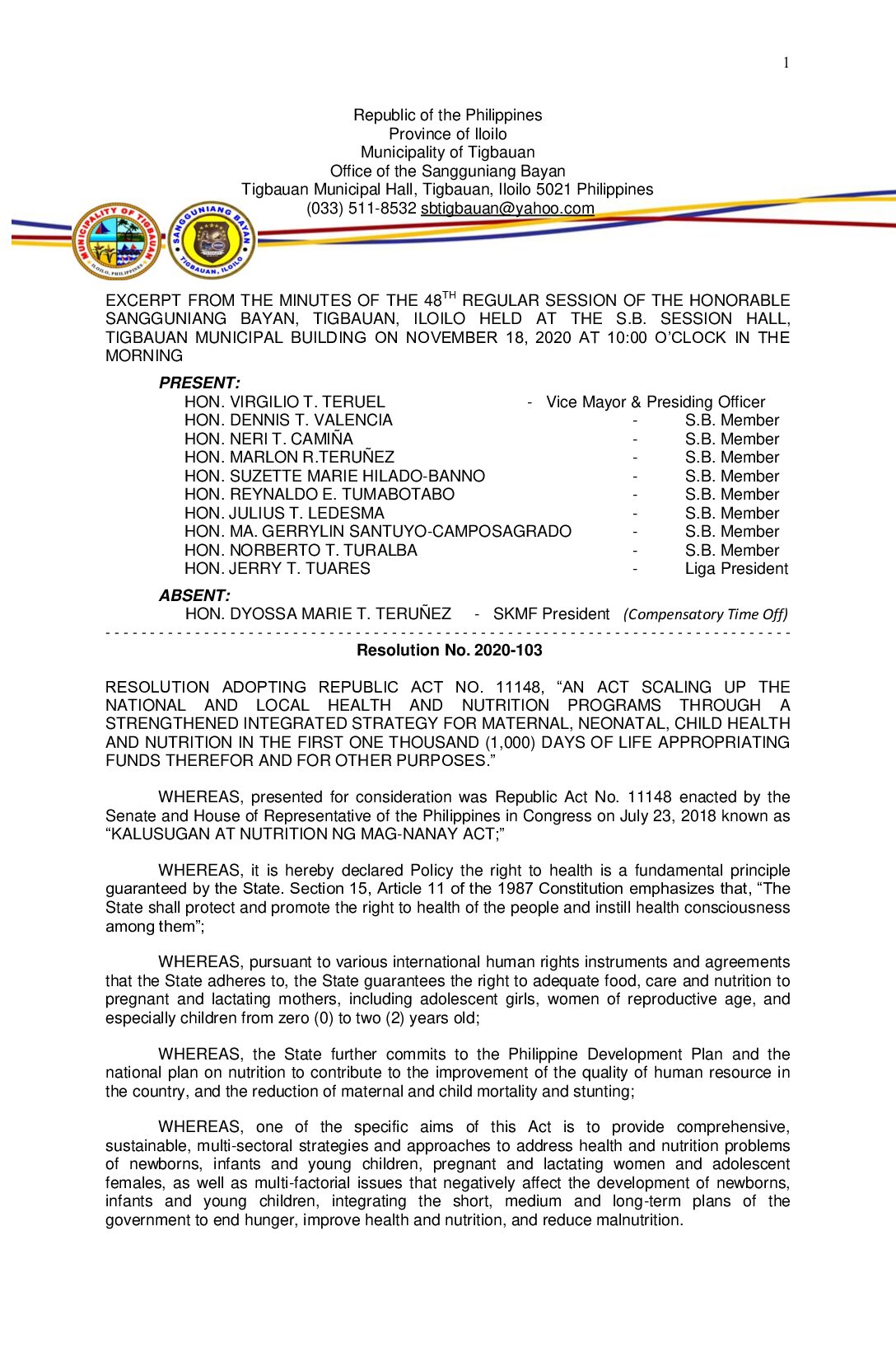 Resolution No. 2020-103 – RESOLUTION ADOPTING REPUBLIC ACT NO. 11148, “AN ACT SCALING UP THE NATIONAL AND LOCAL HEALTH AND NUTRITION PROGRAMS THROUGH A STRENGTHENED INTEGRATED STRATEGY FOR MATERNAL, NEONATAL, CHILD HEALTH AND NUTRITION IN THE FIRST ONE THOUSAND (1,000) DAYS OF LIFE APPROPRIATING FUNDS THEREFOR AND FOR OTHER PURPOSES.”