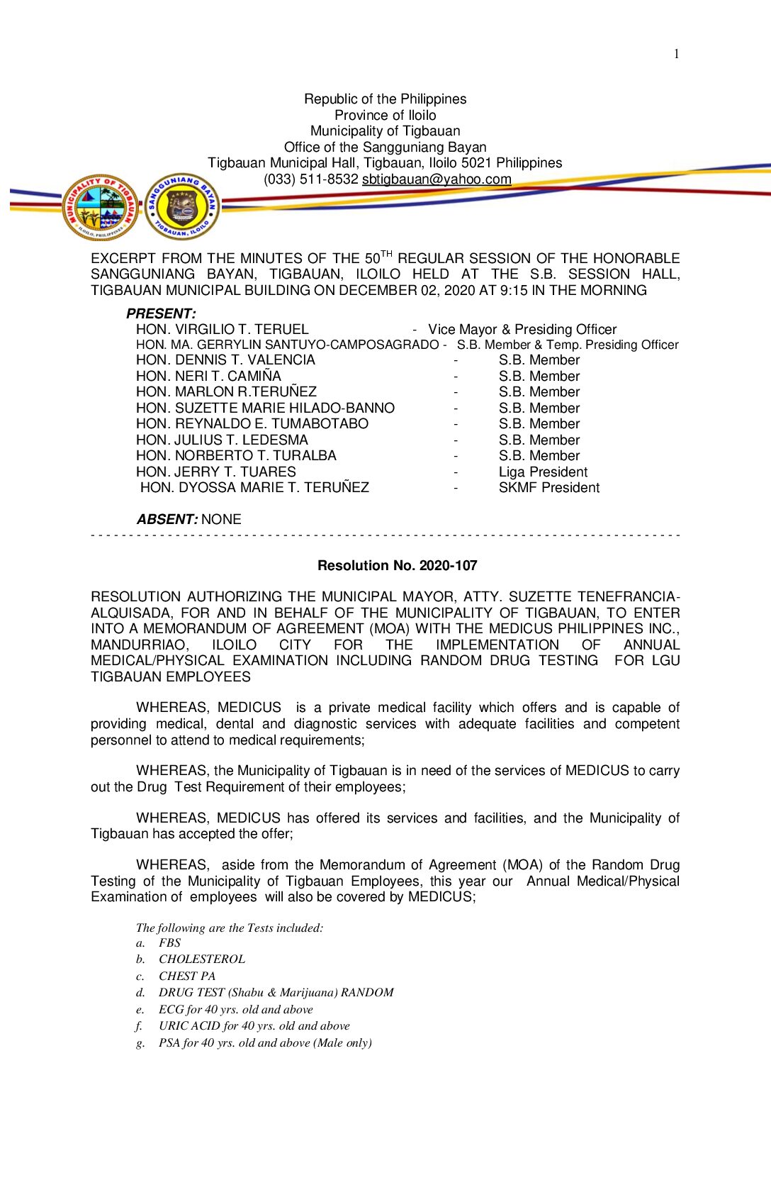 Resolution No. 2020-107 – RESOLUTION AUTHORIZING THE MUNICIPAL MAYOR, ATTY. SUZETTE TENEFRANCIA- ALQUISADA, FOR AND IN BEHALF OF THE MUNICIPALITY OF TIGBAUAN, TO ENTER INTO A MEMORANDUM OF AGREEMENT (MOA) WITH THE MEDICUS PHILIPPINES INC., MANDURRIAO, ILOILO CITY FOR THE IMPLEMENTATION OF ANNUAL MEDICAL/PHYSICAL EXAMINATION INCLUDING RANDOM DRUG TESTING FOR LGU TIGBAUAN EMPLOYEES