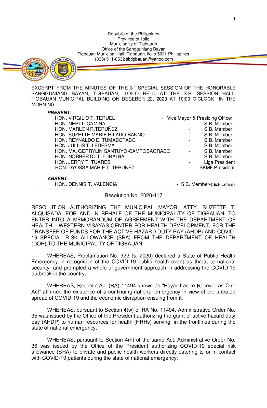 Resolution No. 2020-117 – RESOLUTION AUTHORIZING THE MUNICIPAL MAYOR, ATTY. SUZETTE T. ALQUISADA, FOR AND IN BEHALF OF THE MUNICIPALITY OF TIGBAUAN, TO ENTER INTO A MEMORANDUM OF AGREEMENT WITH THE DEPARTMENT OF HEALTH – WESTERN VISAYAS CENTER FOR HEALTH DEVELOPMENT, FOR THE TRANSFER OF FUNDS FOR THE ACTIVE HAZARD DUTY PAY (AHDP) AND COVID- 19 SPECIAL RISK ALLOWANCE (SRA) FROM THE DEPARTMENT OF HEALTH (DOH) TO THE MUNICIPALITY OF TIGBAUAN
