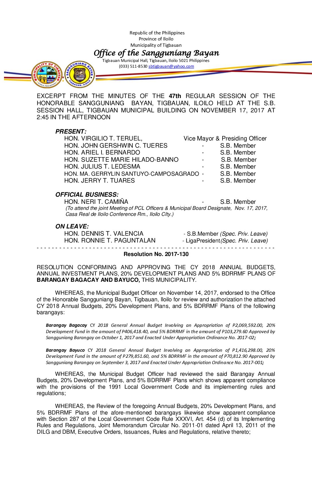 Resolution No. 2017-130 – RESOLUTION CONFORMING AND APPROVING THE CY 2018 ANNUAL BUDGETS, ANNUAL INVESTMENT PLANS, 20% DEVELOPMENT PLANS AND 5% BDRRMF PLANS OF BARANGAY BAGACAY AND BAYUCO, THIS MUNICIPALITY.