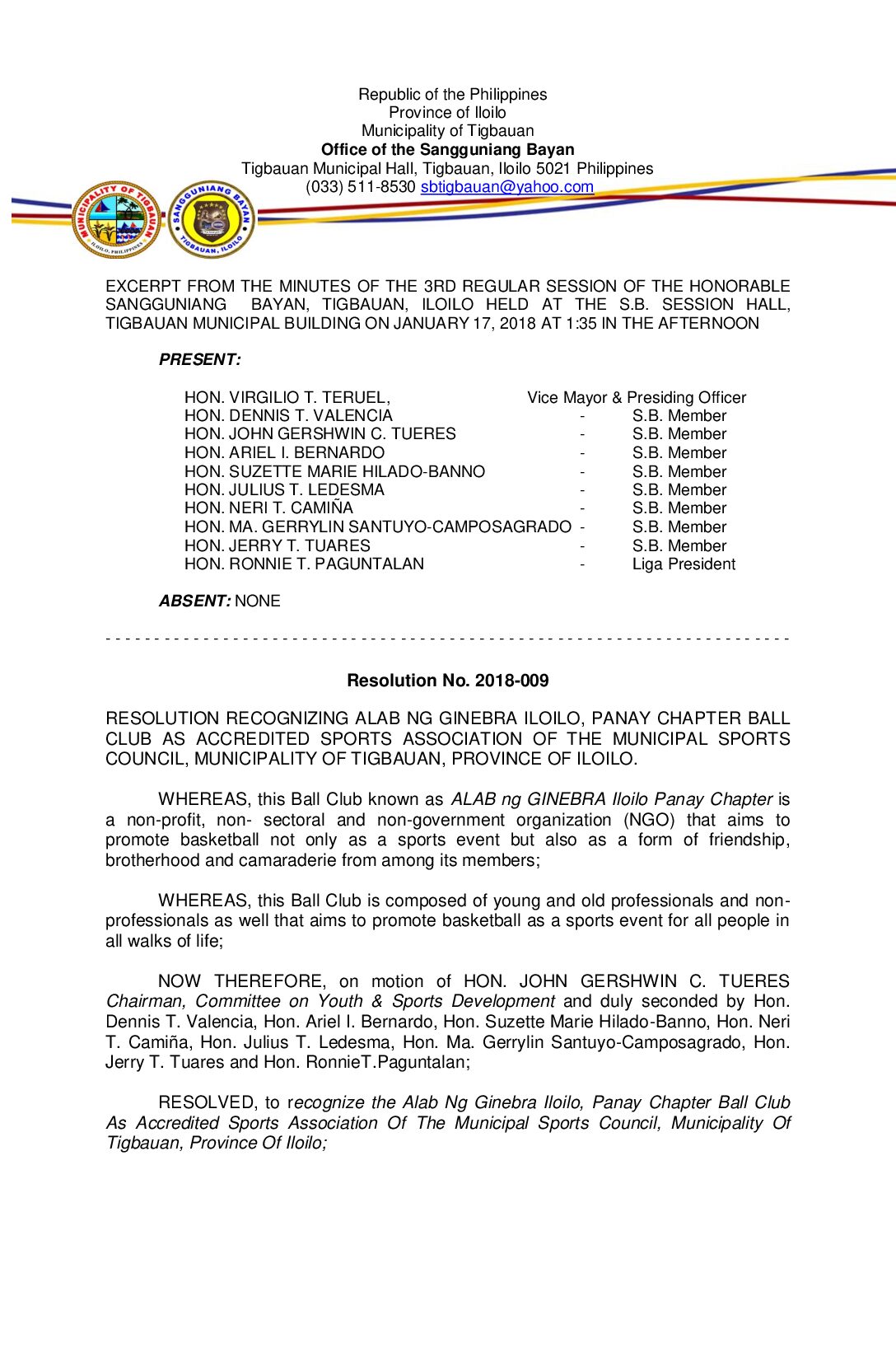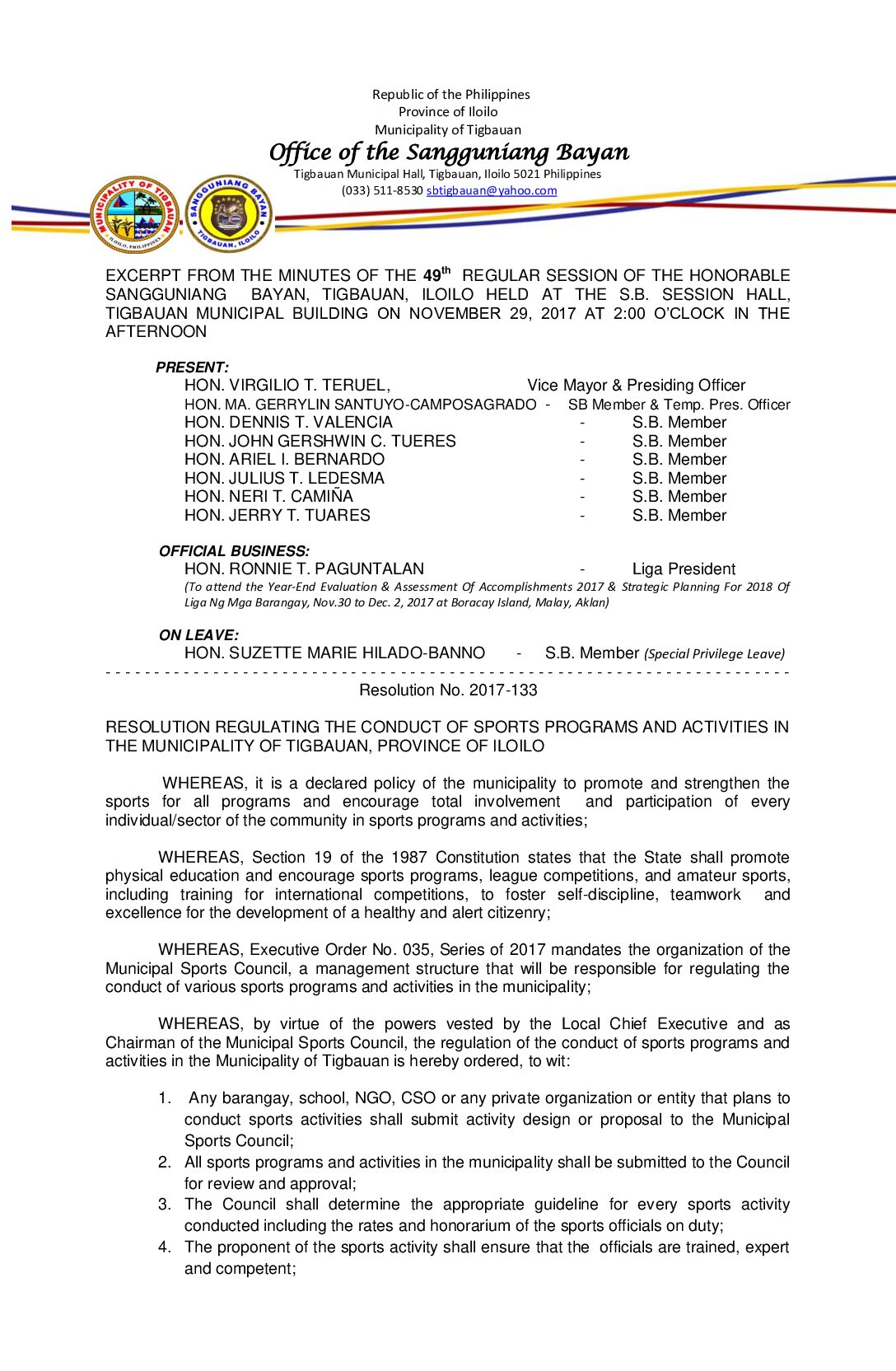 Resolution No. 2017-133 – RESOLUTION REGULATING THE CONDUCT OF SPORTS PROGRAMS AND ACTIVITIES IN THE MUNICIPALITY OF TIGBAUAN, PROVINCE OF ILOILO
