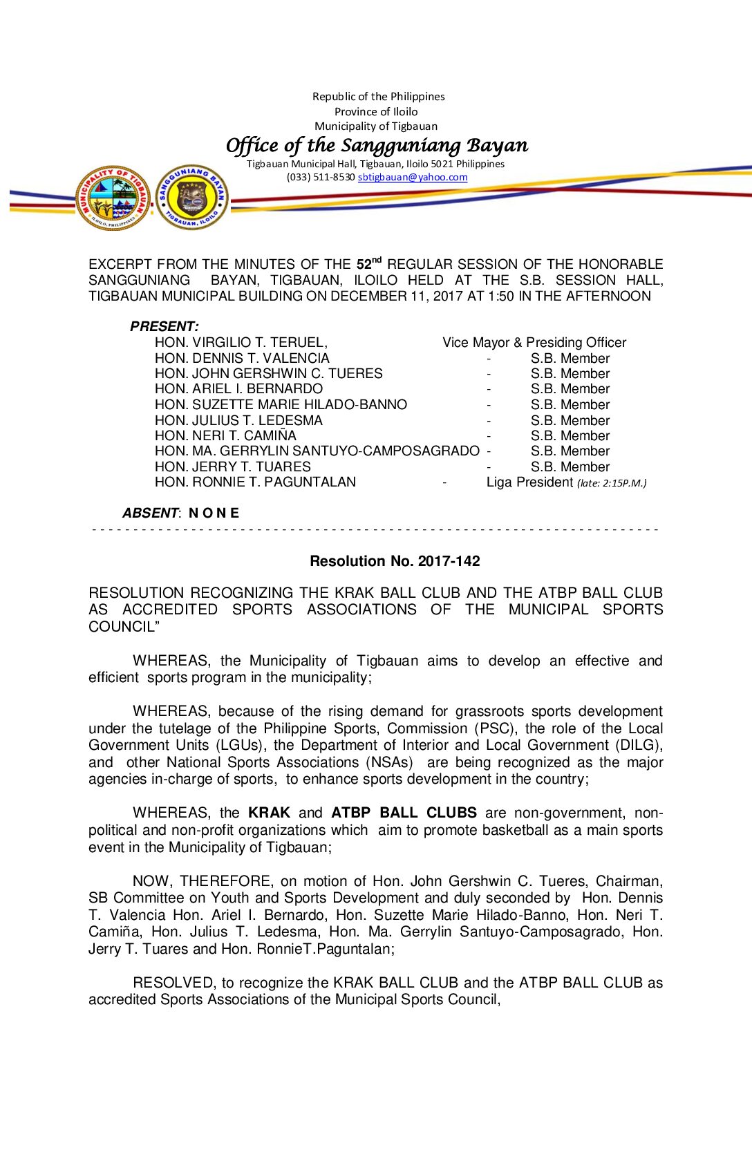 Resolution No. 2017-142 – RESOLUTION RECOGNIZING THE KRAK BALL CLUB AND THE ATBP BALL CLUB AS ACCREDITED SPORTS ASSOCIATIONS OF THE MUNICIPAL SPORTS COUNCIL”