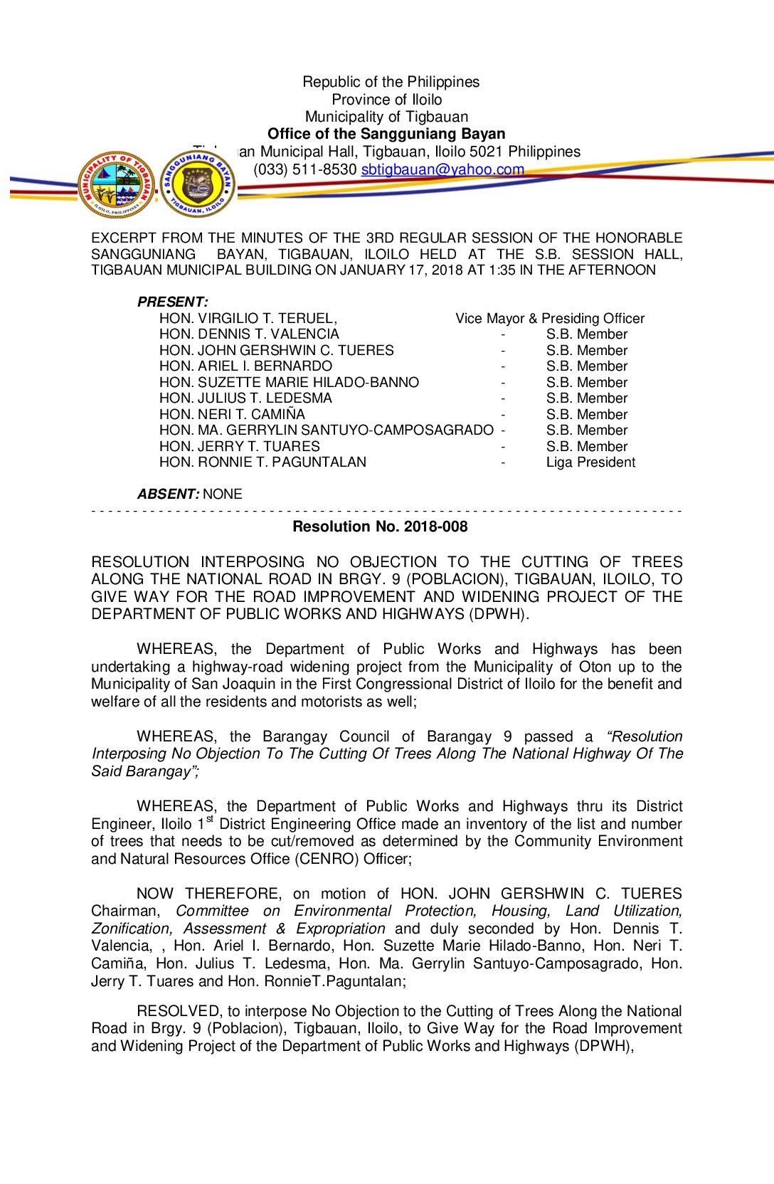 Resolution No. 2018-008 – RESOLUTION INTERPOSING NO OBJECTION TO THE CUTTING OF TREES ALONG THE NATIONAL ROAD IN BRGY. 9 (POBLACION), TIGBAUAN, ILOILO, TO GIVE WAY FOR THE ROAD IMPROVEMENT AND WIDENING PROJECT OF THE DEPARTMENT OF PUBLIC WORKS AND HIGHWAYS (DPWH).