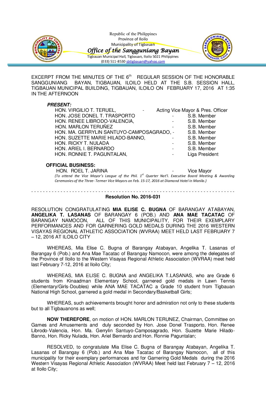 Resolution No. 2016-031