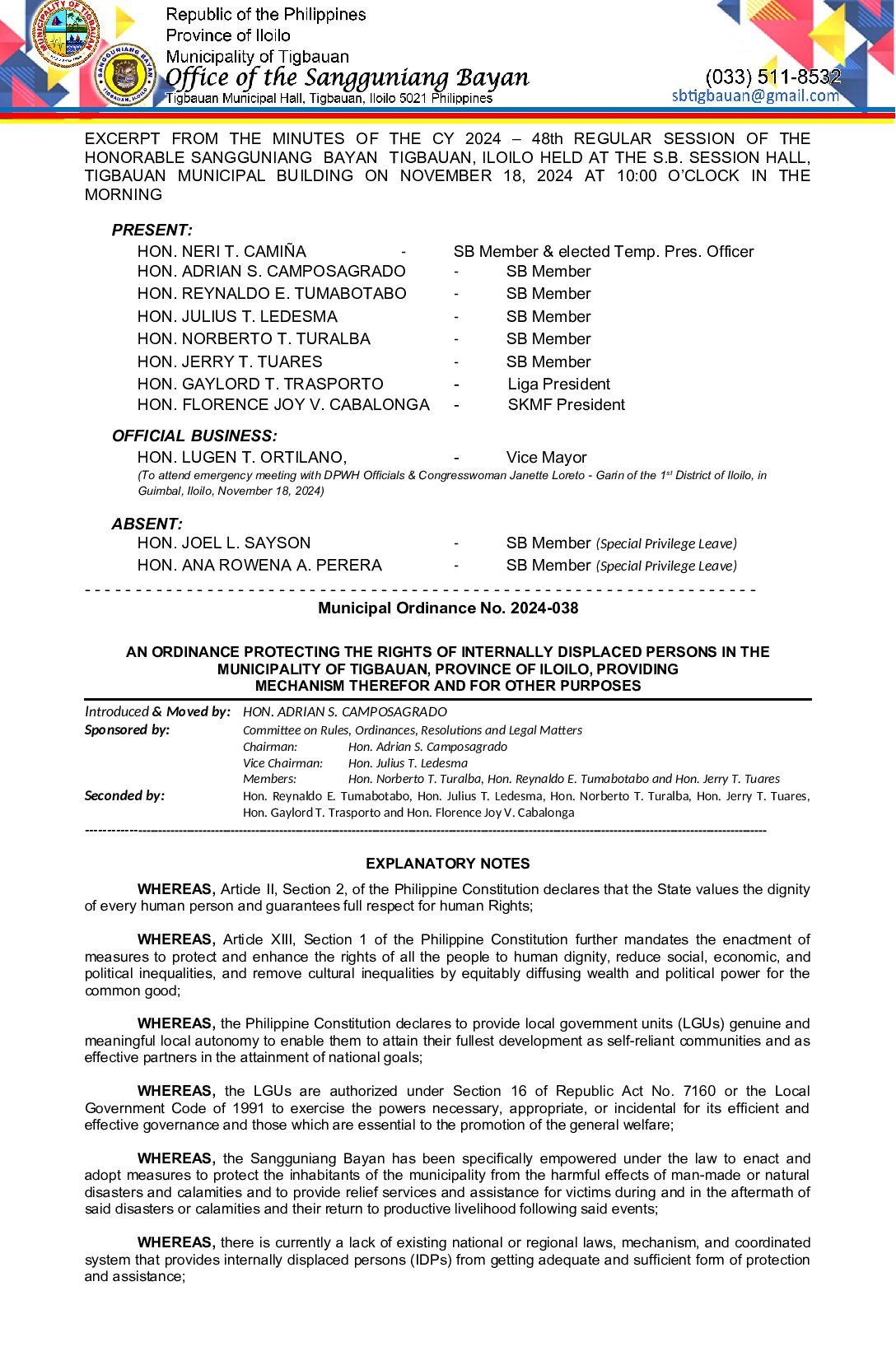 Municipal Ordinance No. 2024-038 – AN ORDINANCE PROTECTING THE RIGHTS OF INTERNALLY DISPLACED PERSONS IN THE MUNICIPALITY OF TIGBAUAN, PROVINCE OF ILOILO, PROVIDING MECHANISM THEREFOR AND FOR OTHER PURPOSES