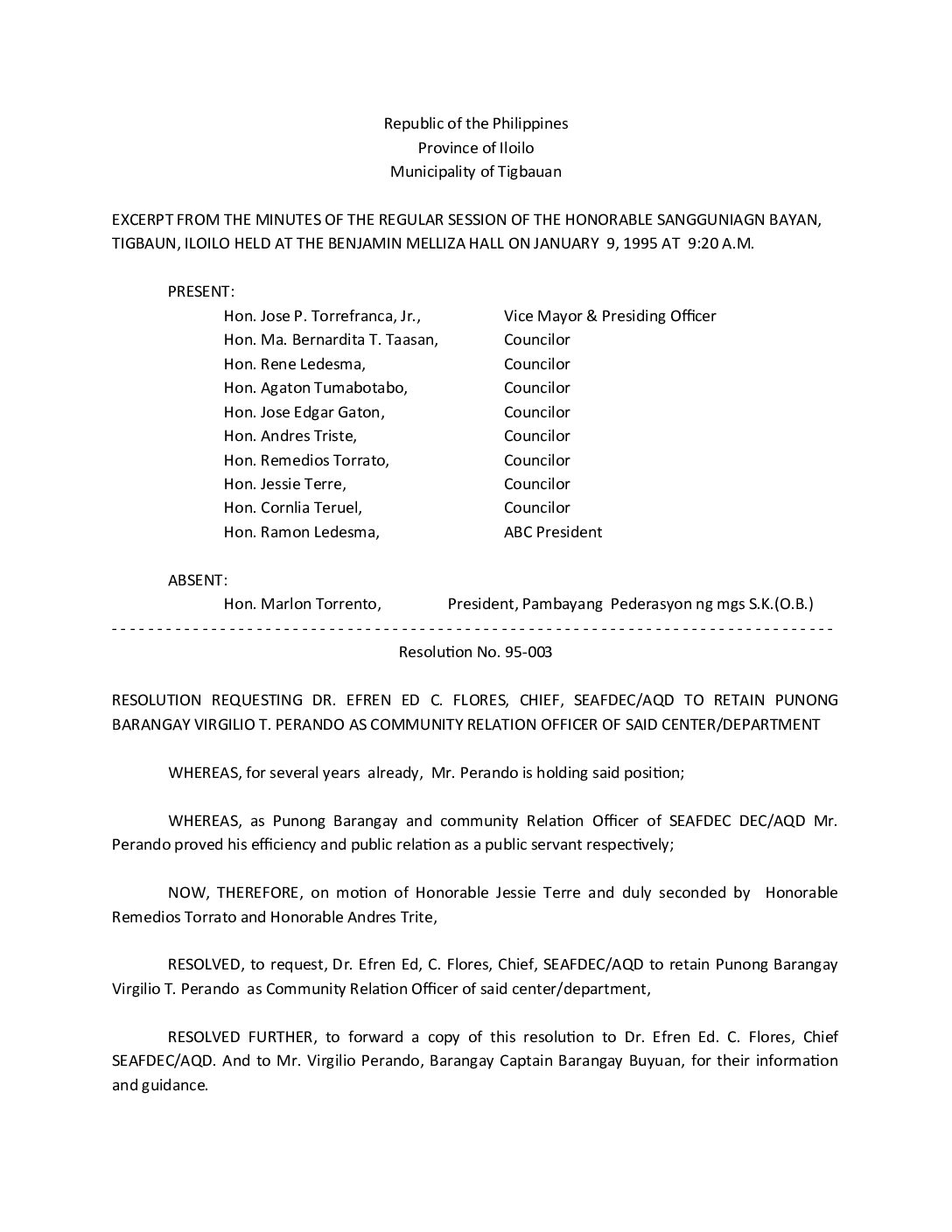 Resolution No. 95-003