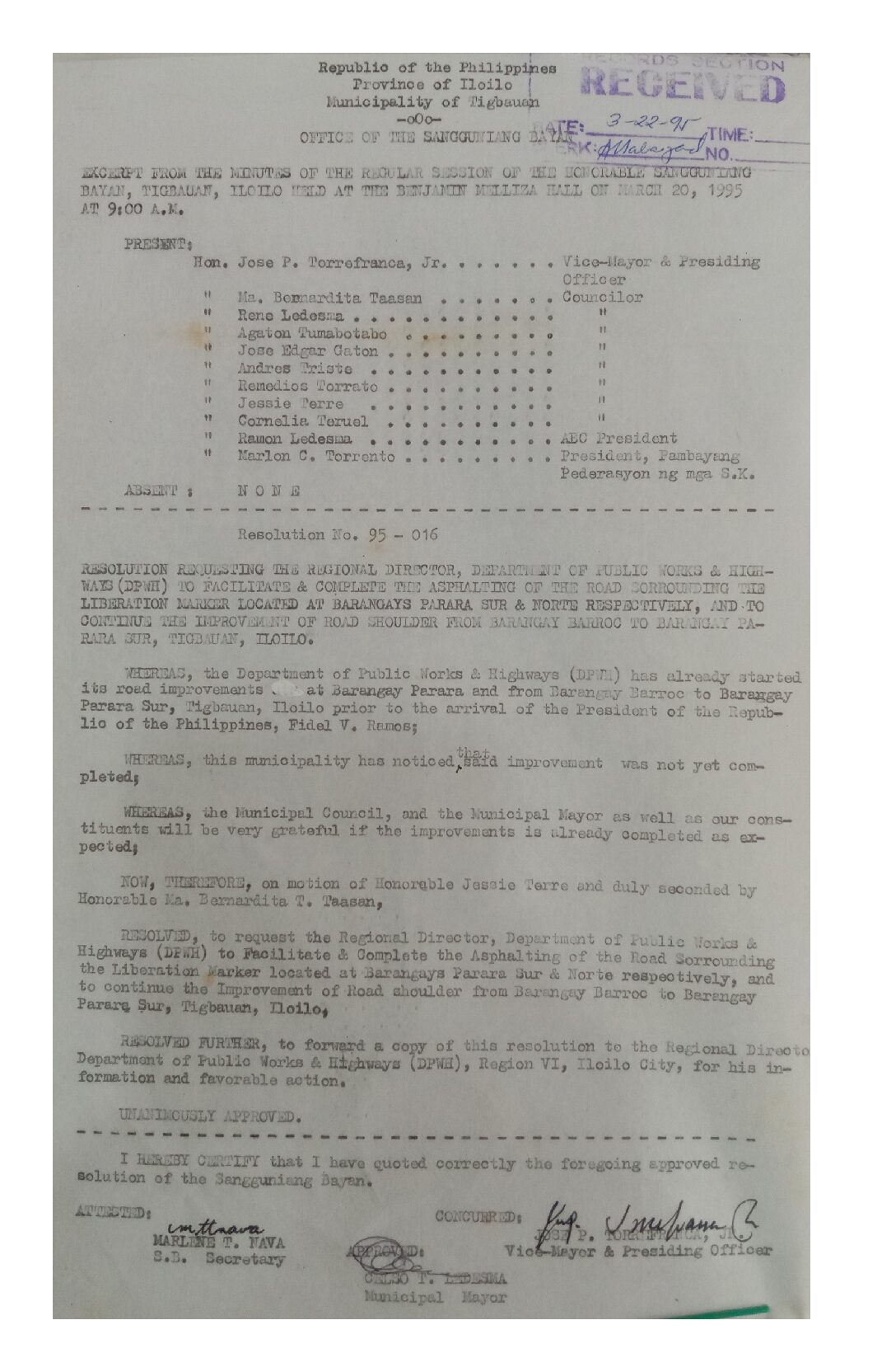 Resolution No. 95-016