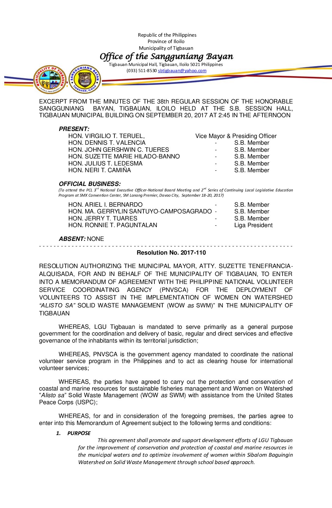 Resolution No. 2017-110 – RESOLUTION AUTHORIZING THE MUNICIPAL MAYOR, ATTY. SUZETTE TENEFRANCIA- ALQUISADA, FOR AND IN BEHALF OF THE MUNICIPALITY OF TIGBAUAN, TO ENTER INTO A MEMORANDUM OF AGREEMENT WITH THE PHILIPPINE NATIONAL VOLUNTEER SERVICE COORDINATING AGENCY (PNVSCA) FOR THE DEPLOYMENT OF VOLUNTEERS TO ASSIST IN THE IMPLEMENTATION OF WOMEN ON WATERSHED “ALISTO SA” SOLID WASTE MANAGEMENT (WOW as SWM)” IN THE MUNICIPALITY OF TIGBAUAN