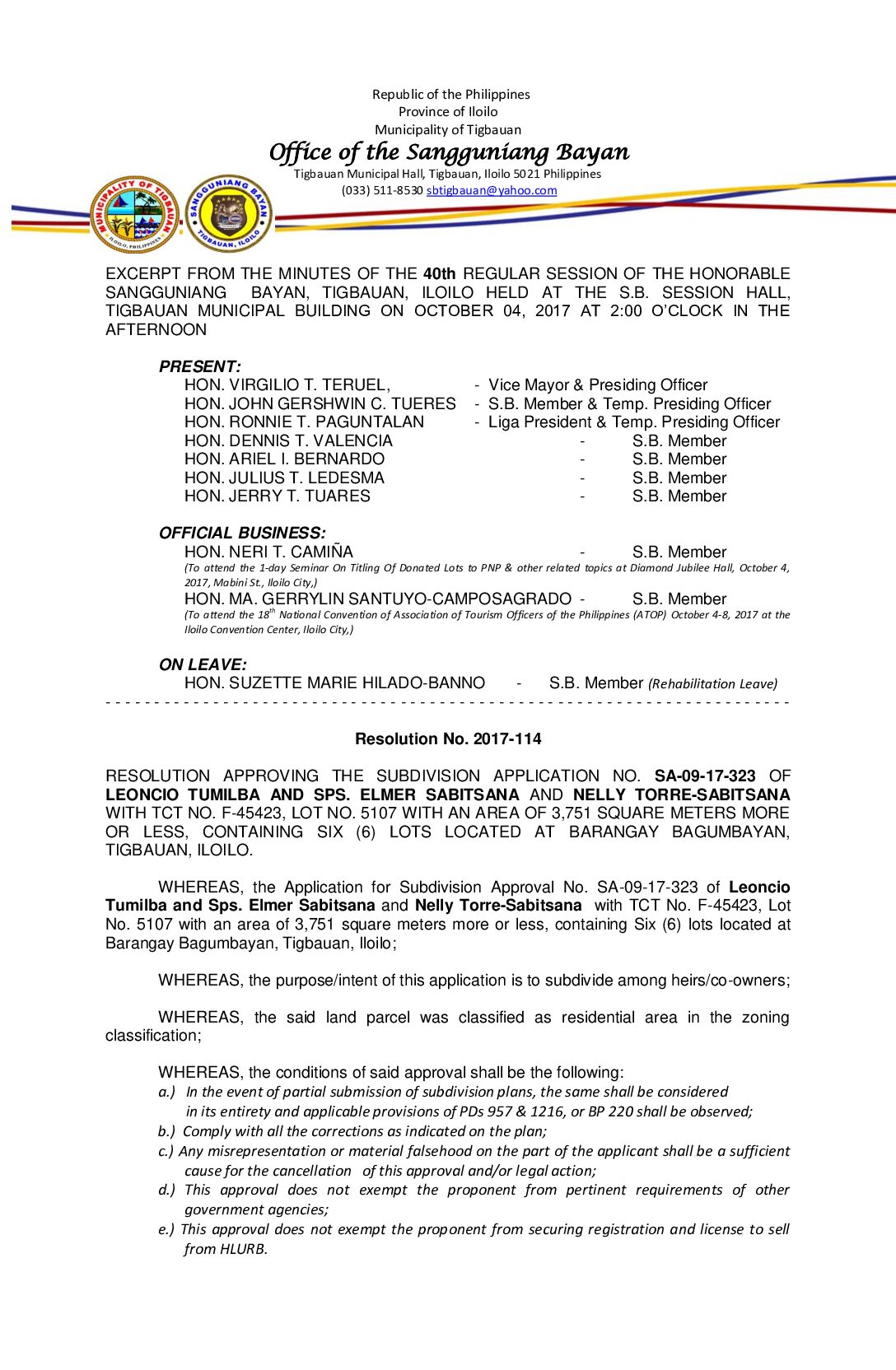 Resolution No. 2017-114 – RESOLUTION APPROVING THE SUBDIVISION APPLICATION NO. SA-09-17-323 OF LEONCIO TUMILBA AND SPS. ELMER SABITSANA AND NELLY TORRE-SABITSANA WITH TCT NO. F-45423, LOT NO. 5107 WITH AN AREA OF 3,751 SQUARE METERS MORE OR LESS, CONTAINING SIX (6) LOTS LOCATED AT BARANGAY BAGUMBAYAN, TIGBAUAN, ILOILO.