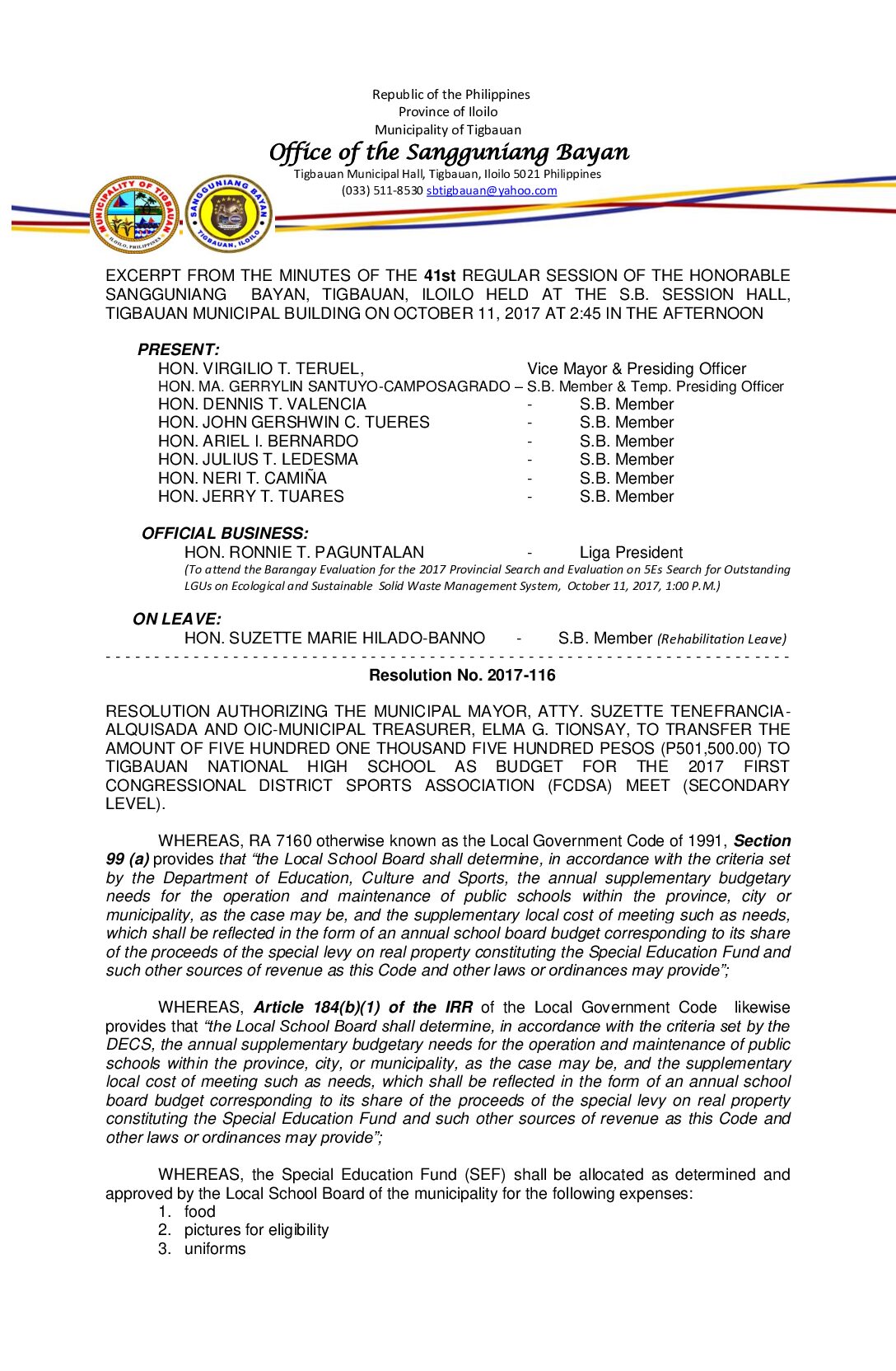 Resolution No. 2017-116 – RESOLUTION AUTHORIZING THE MUNICIPAL MAYOR, ATTY. SUZETTE TENEFRANCIA- ALQUISADA AND OIC-MUNICIPAL TREASURER, ELMA G. TIONSAY, TO TRANSFER THE AMOUNT OF FIVE HUNDRED ONE THOUSAND FIVE HUNDRED PESOS (P501,500.00) TO TIGBAUAN NATIONAL HIGH SCHOOL AS BUDGET FOR THE 2017 FIRST CONGRESSIONAL DISTRICT SPORTS ASSOCIATION (FCDSA) MEET (SECONDARY LEVEL).
