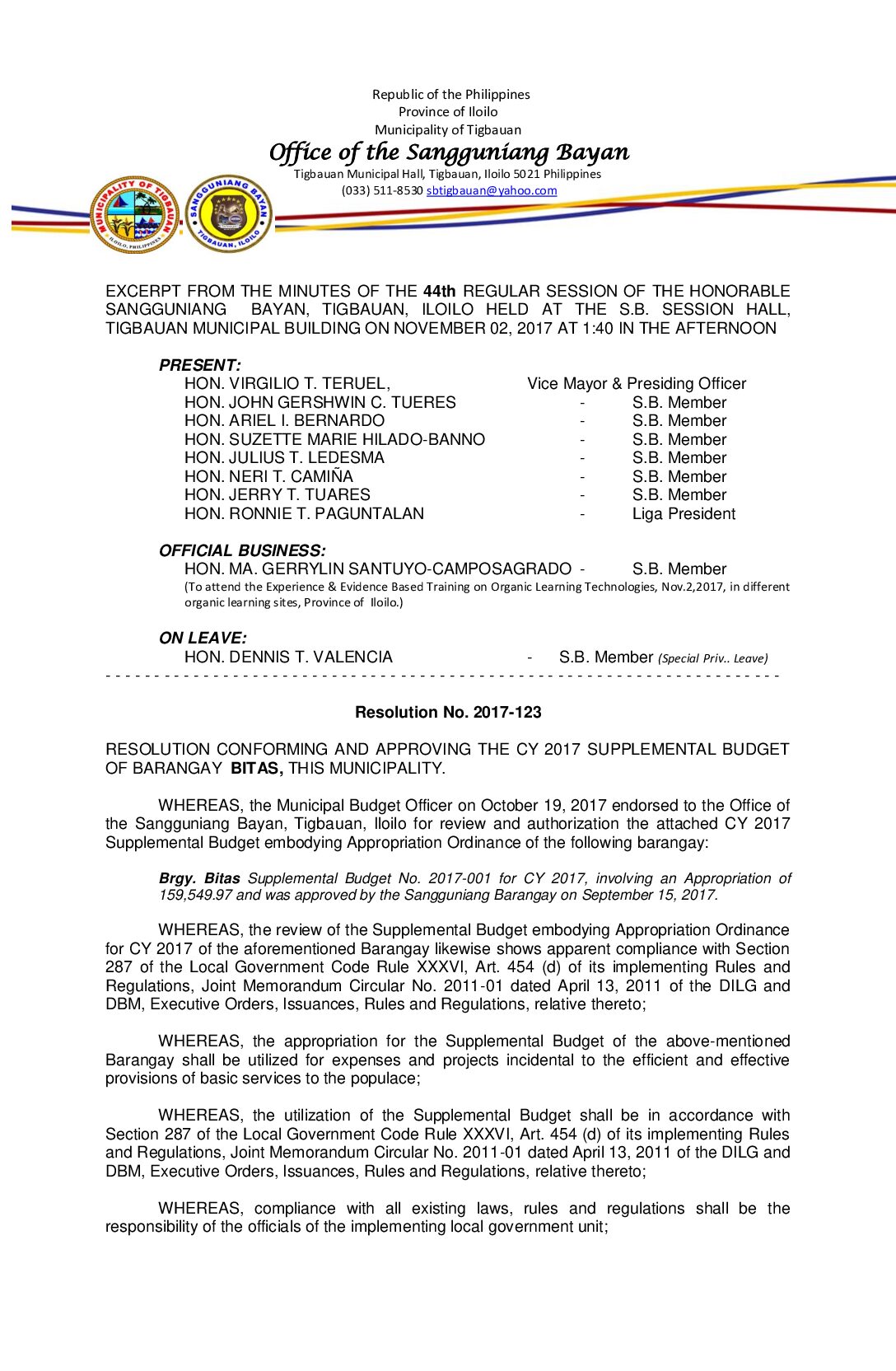 Resolution No. 2017-123 – RESOLUTION CONFORMING AND APPROVING THE CY 2017 SUPPLEMENTAL BUDGET OF BARANGAY BITAS, THIS MUNICIPALITY.