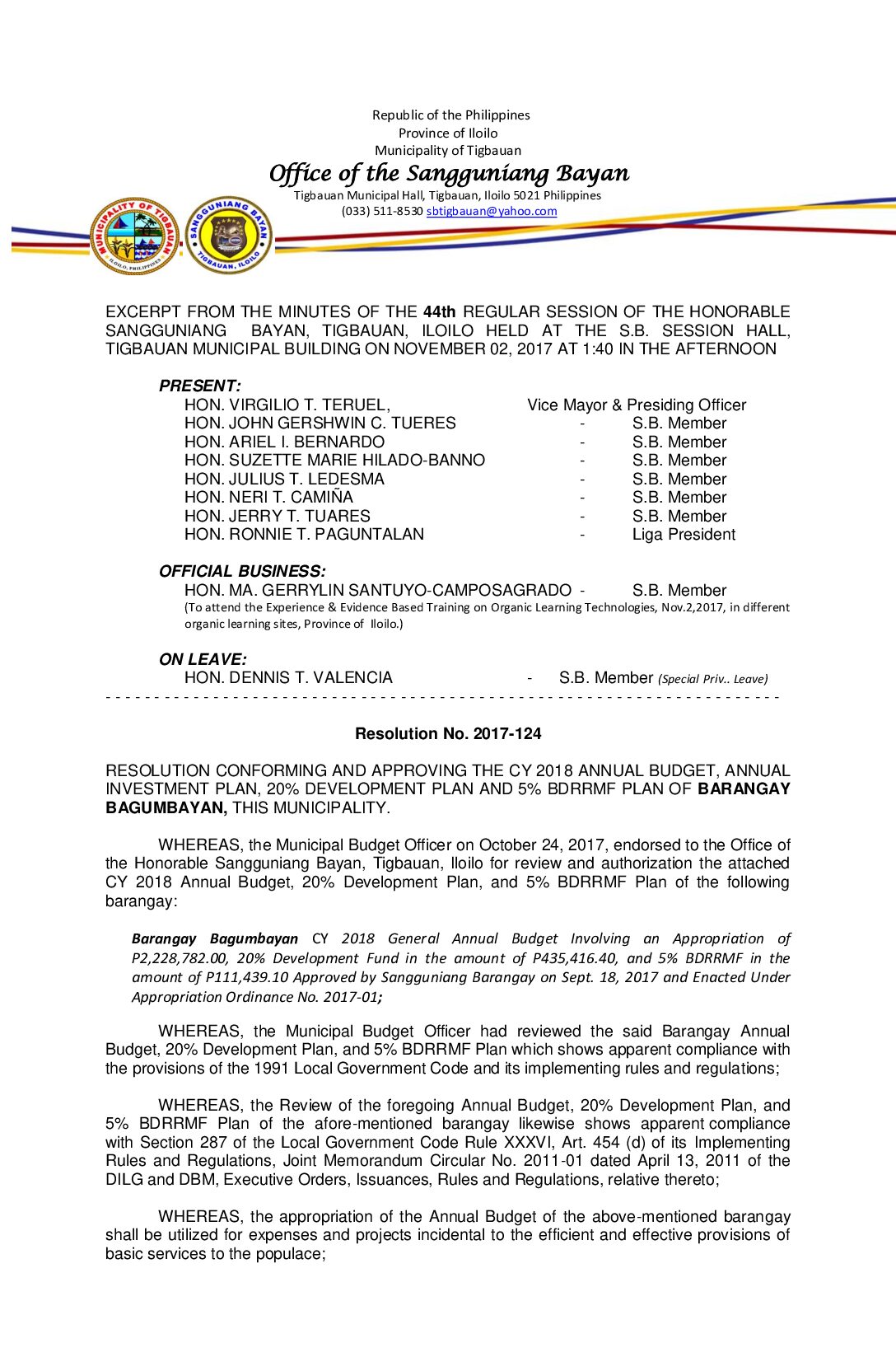 Resolution No. 2017-124 – RESOLUTION CONFORMING AND APPROVING THE CY 2018 ANNUAL BUDGET, ANNUAL INVESTMENT PLAN, 20% DEVELOPMENT PLAN AND 5% BDRRMF PLAN OF BARANGAY BAGUMBAYAN, THIS MUNICIPALITY.