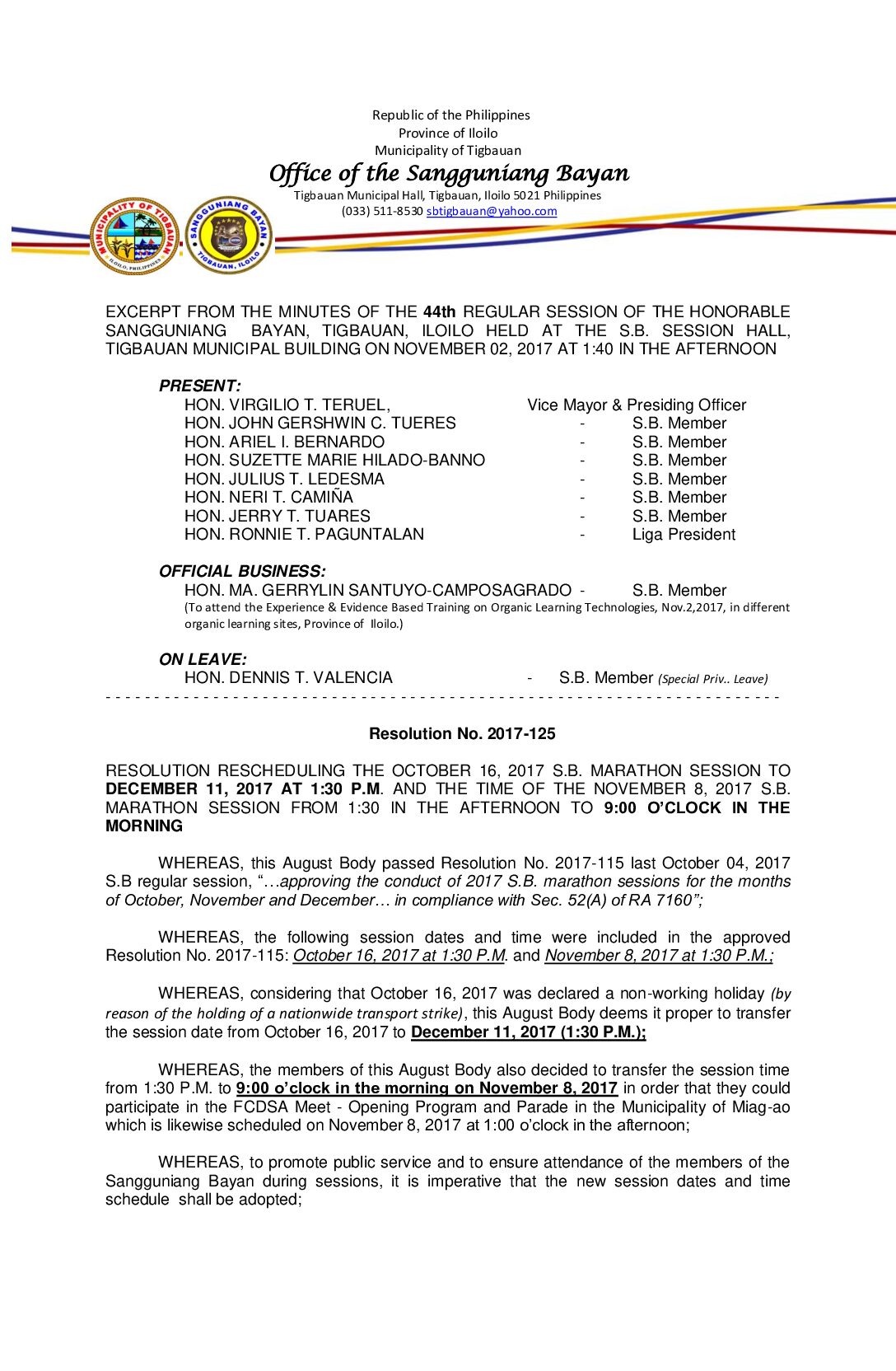Resolution No. 2017-125 – RESOLUTION RESCHEDULING THE OCTOBER 16, 2017 S.B. MARATHON SESSION TO DECEMBER 11, 2017 AT 1:30 P.M. AND THE TIME OF THE NOVEMBER 8, 2017 S.B. MARATHON SESSION FROM 1:30 IN THE AFTERNOON TO 9:00 O’CLOCK IN THE MORNING