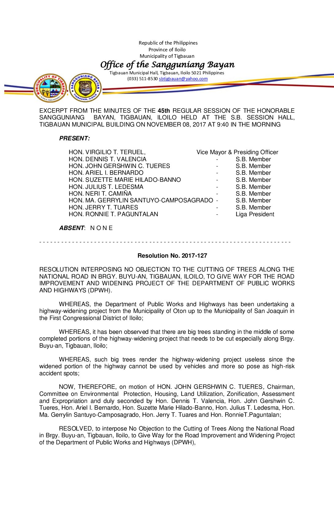 Resolution No. 2017-127 – RESOLUTION INTERPOSING NO OBJECTION TO THE CUTTING OF TREES ALONG THE NATIONAL ROAD IN BRGY. BUYU-AN, TIGBAUAN, ILOILO, TO GIVE WAY FOR THE ROAD IMPROVEMENT AND WIDENING PROJECT OF THE DEPARTMENT OF PUBLIC WORKS AND HIGHWAYS (DPWH).