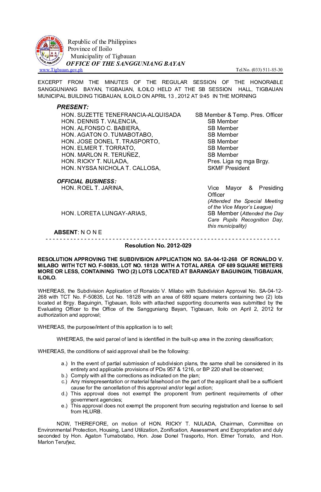 Resolution No. 2012-029