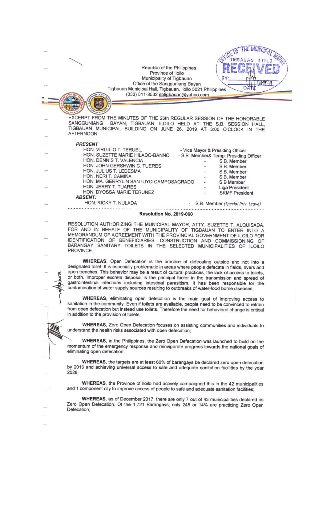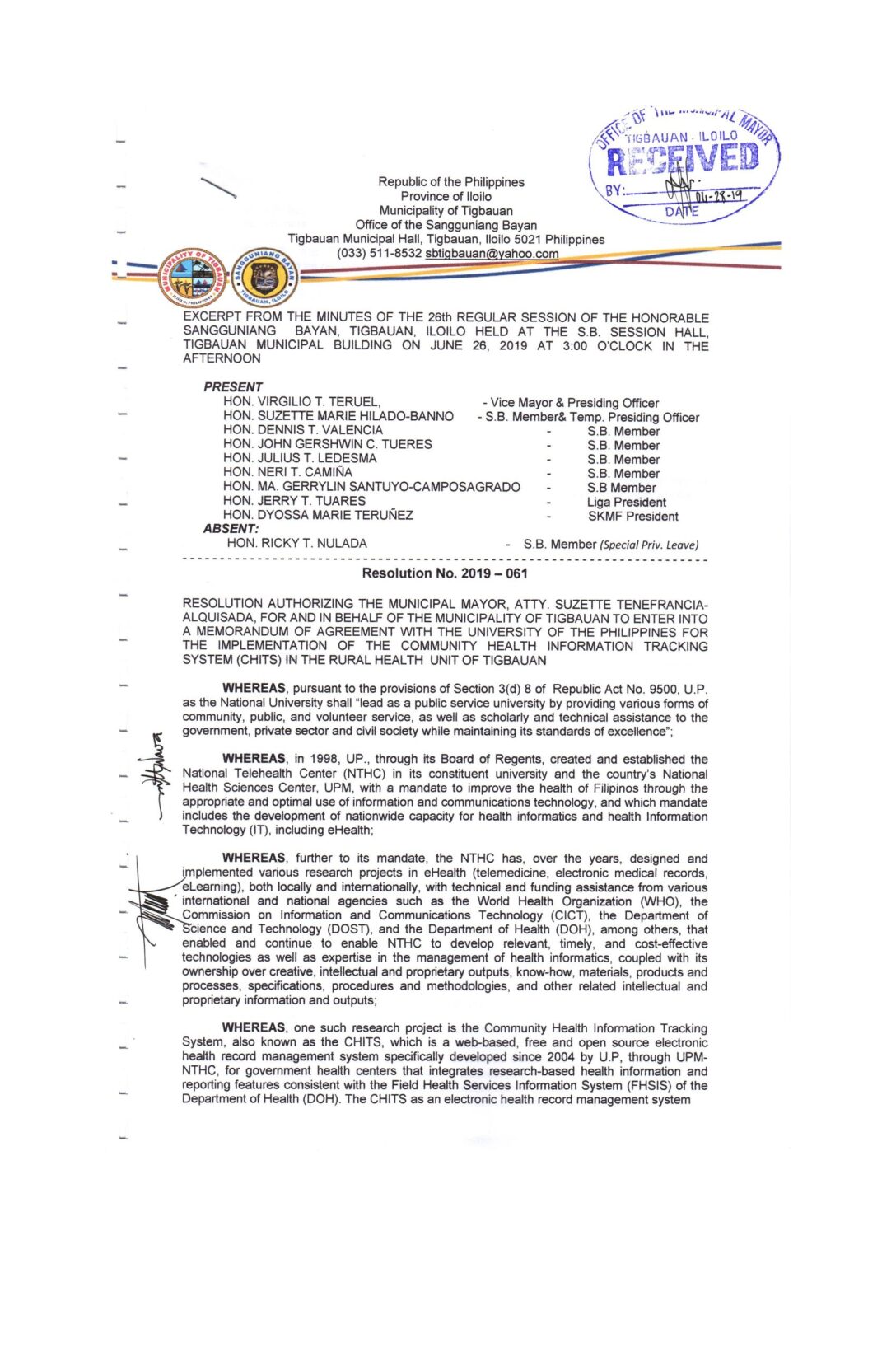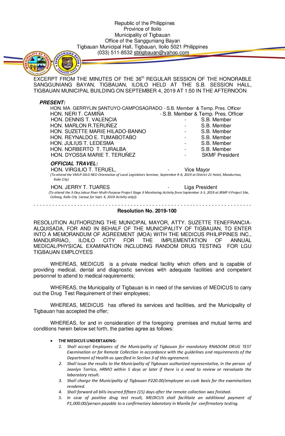 Resolution No. 2019-100 – RESOLUTION AUTHORIZING THE MUNICIPAL MAYOR, ATTY. SUZETTE TENEFRANCIA- ALQUISADA, FOR AND IN BEHALF OF THE MUNICIPALITY OF TIGBAUAN, TO ENTER INTO A MEMORANDUM OF AGREEMENT (MOA) WITH THE MEDICUS PHILIPPINES INC., MANDURRIAO, ILOILO CITY FOR THE IMPLEMENTATION OF ANNUAL MEDICAL/PHYSICAL EXAMINATION INCLUDING RANDOM DRUG TESTING FOR LGU TIGBAUAN EMPLOYEES